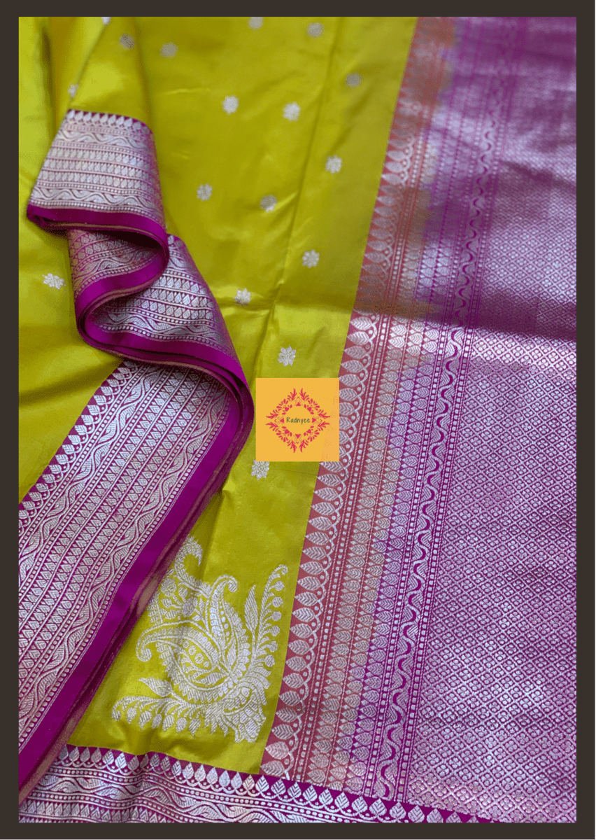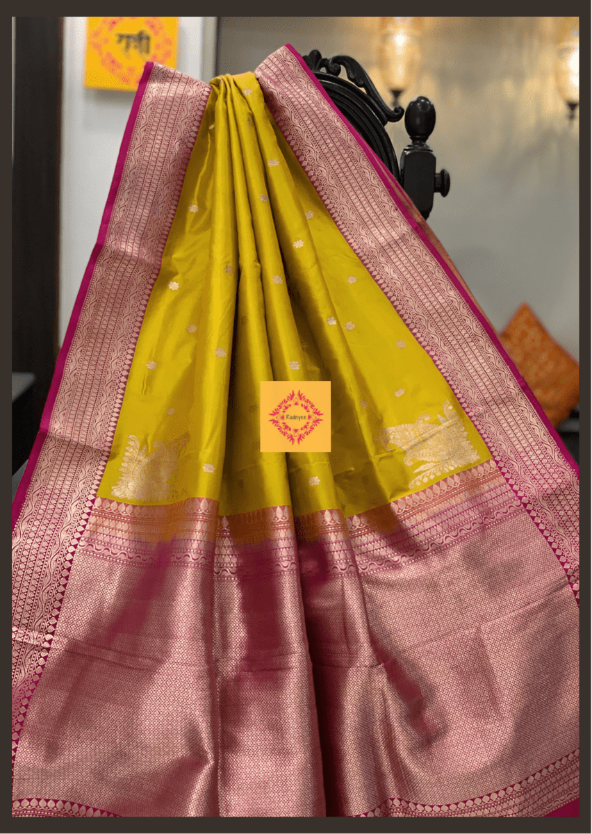 A Mustard-Green Dual Toned Pure Katan Silk Banarasi Saree with Magenta Pallu & Golden Zari