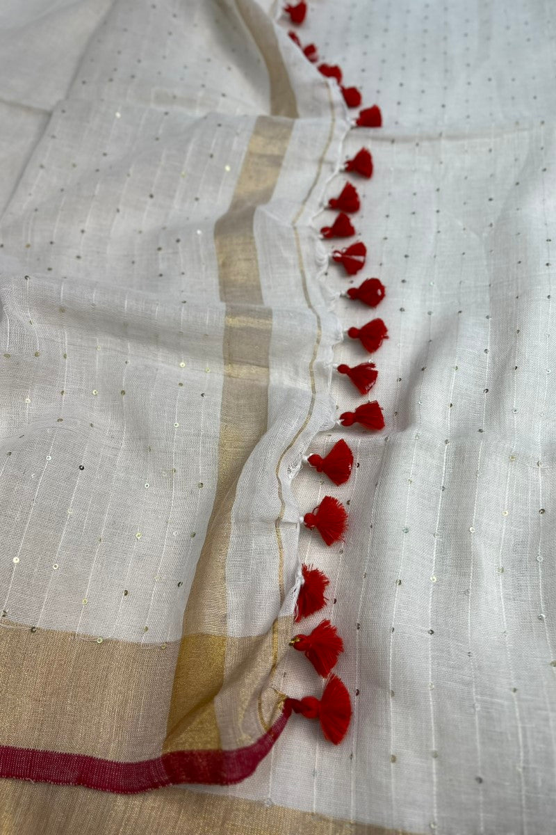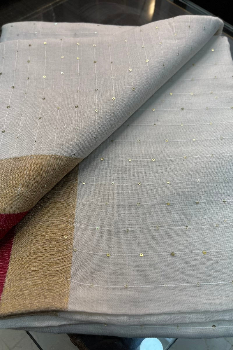 These sarees are having weaved sequins all over the saree!Each sequin is weaved with linen thread while weaving saree.