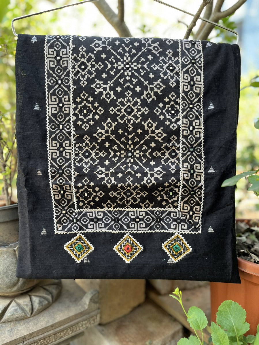 Ajrakh Printed Mashroo Silk Patchwork on Yoke.