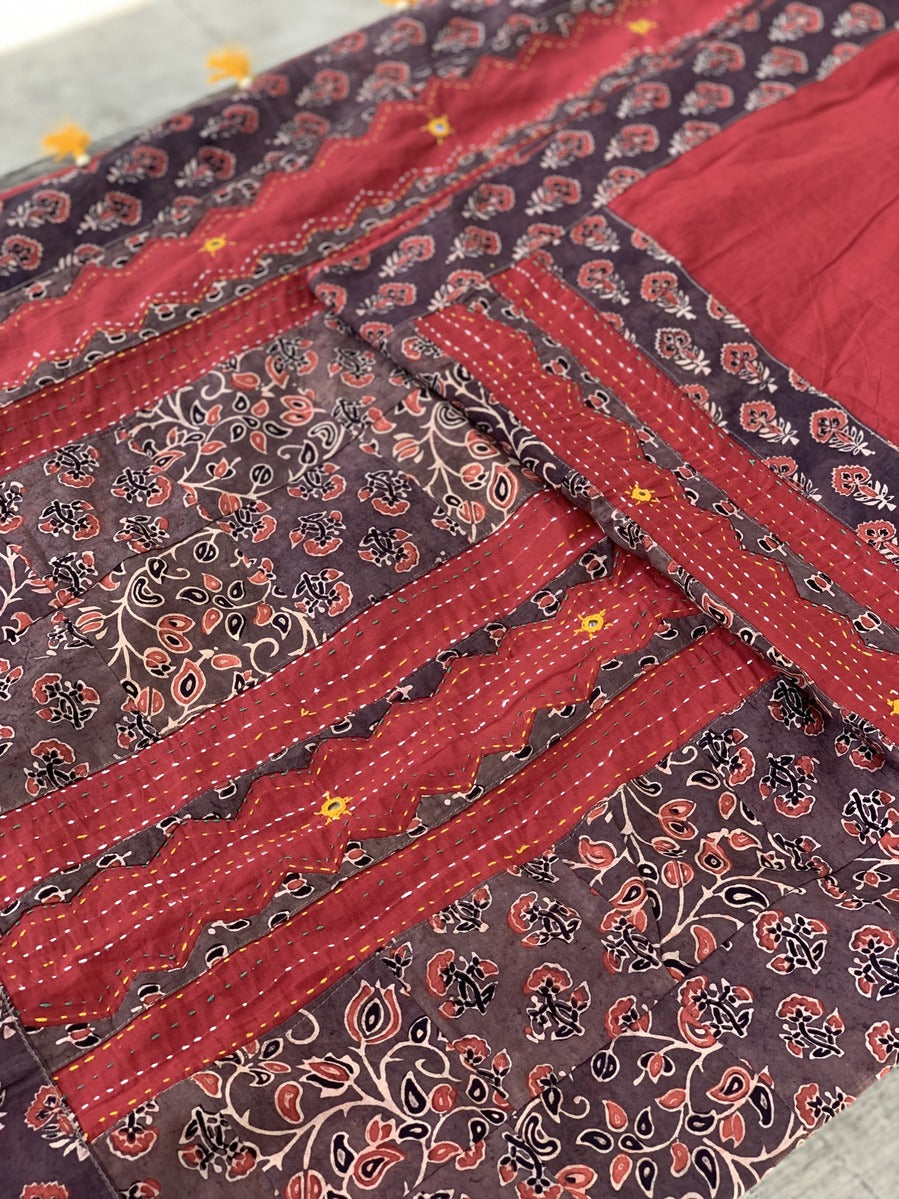 This is a special range of soft cotton Ajrakh Hand Block printed patchwork sarees with Gudri embroidery and mirror work. A Summer Story by second generation skilled artisans of Barmer, Rajasthan.