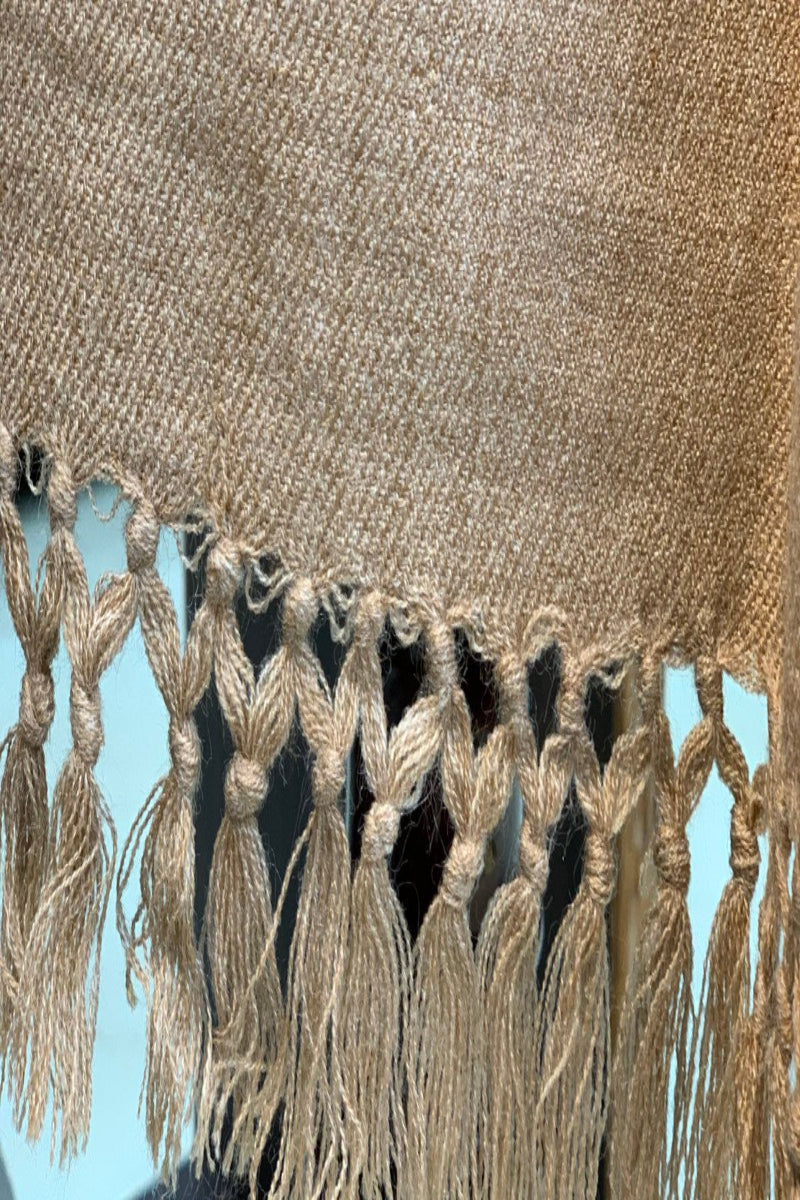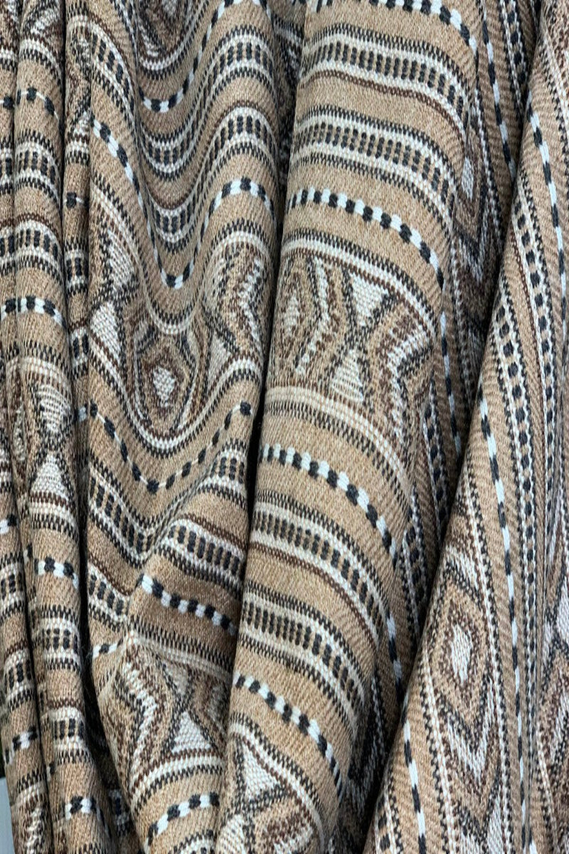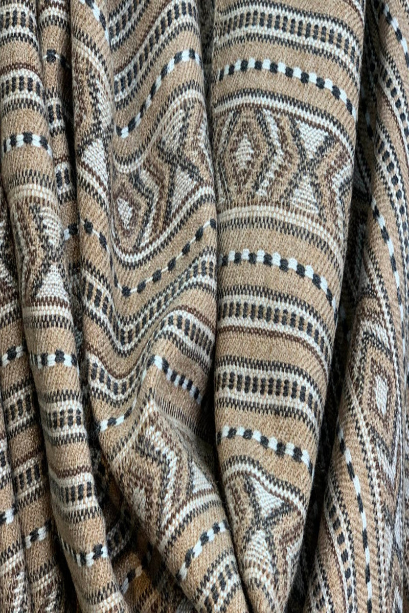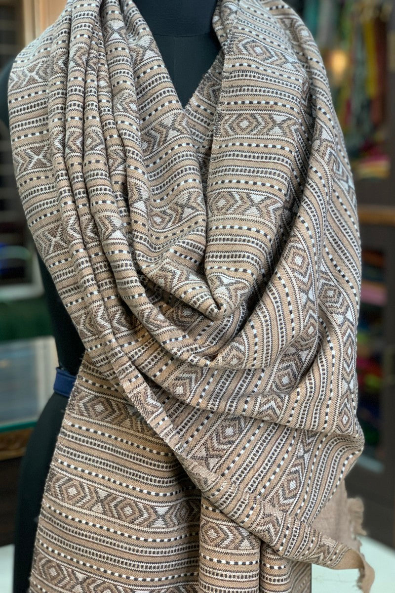 Journey to the heart of the Himalayas with this enchanting camel brown Pahadi stole. Its intricate black and white patterns tell stories of ancient traditions and the breathtaking landscapes of the mountains.