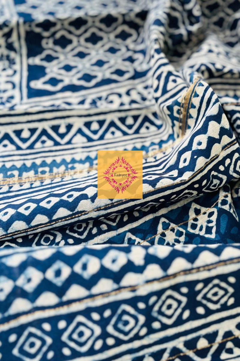 Handblock Bagru prints!!Do you remember how in our childhood, we used to cut a ladyfinger into two and dip it into watercolour to make patterns?That’s how you can understand hand block printings. The fine and adorable prints in different shapes, colours, and designs.Truly, our weavers from Rajasthan doesn’t only create the fabric with prints but they actually create a magic!!Radnyee brings this magic directly from our weavers to your doorstep.Presenting stunning traditional Bagru Handblock prints on Chanderi cotton sarees in vegetable dyes!! Fabric-: lightweight Chanderi cotton. Blouse piece included.
