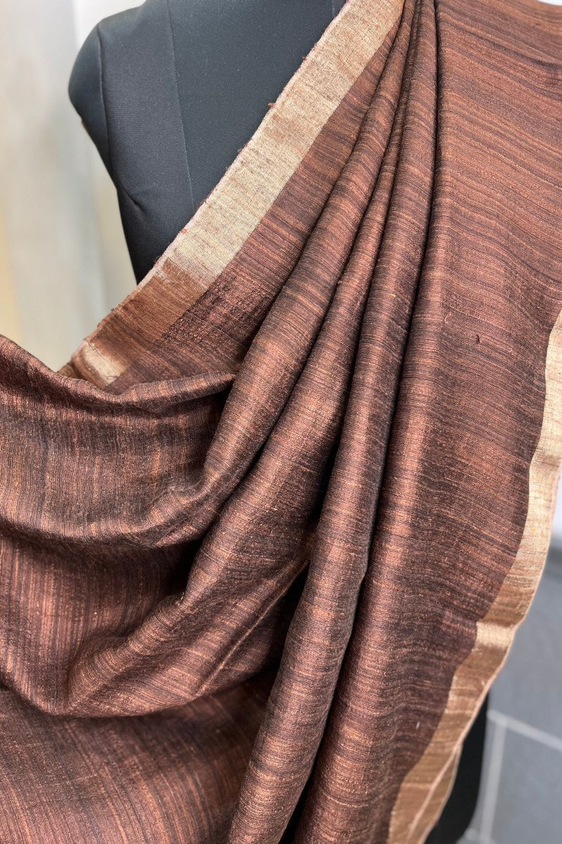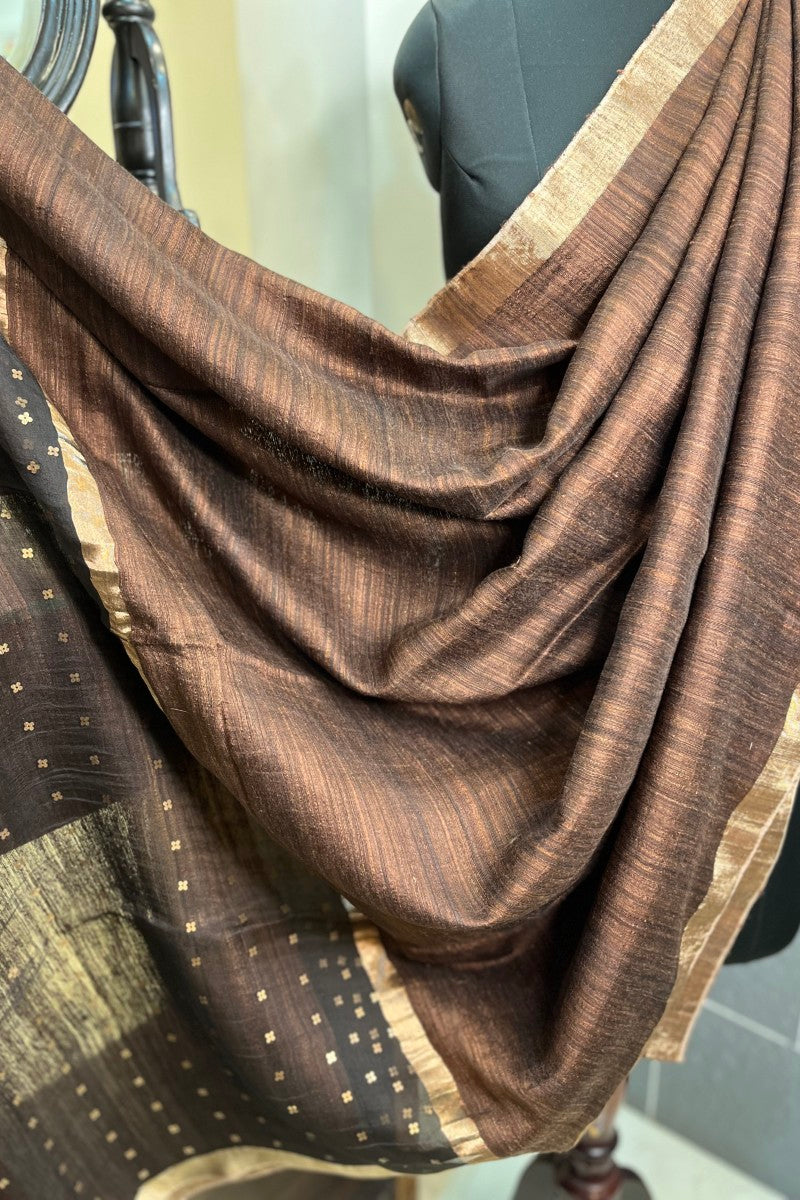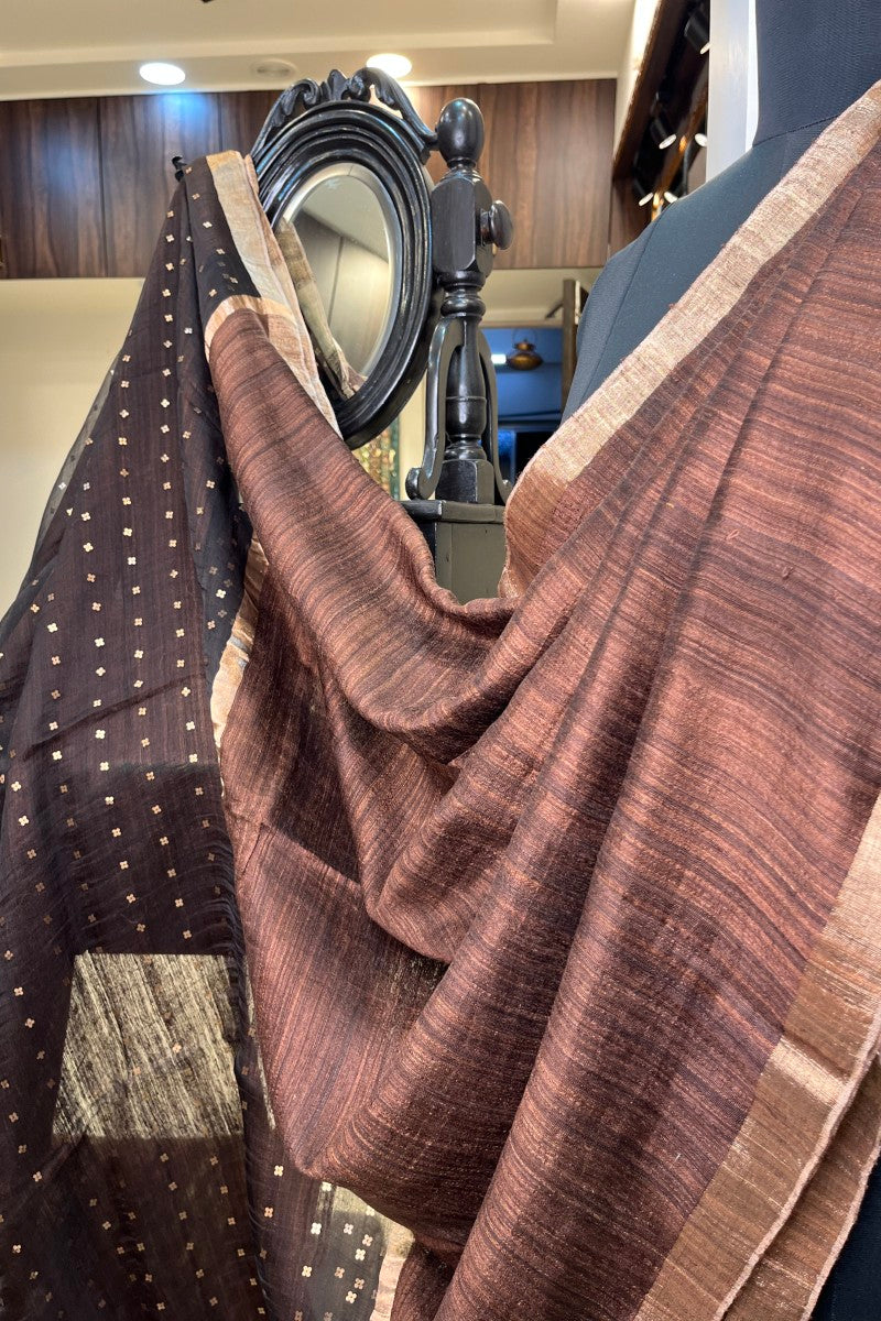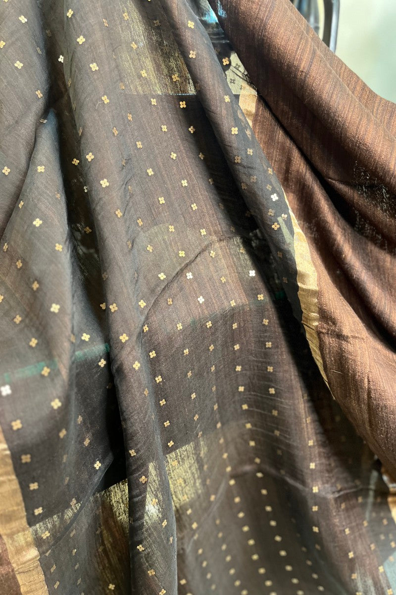 Pure Matka Silk Handloom Saree in a classic Coffee Brown shade, enhanced with a golden zari border. The pallu glows with finely woven sequins, creating an elegant balance of texture, tradition, and understated glamour.