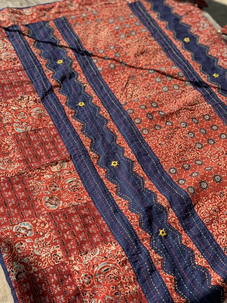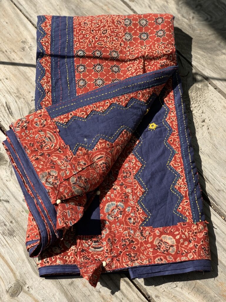 This is a special range of soft cotton Ajrakh Hand Block printed patchwork sarees with Gudri embroidery and mirror work. A Summer Story by second generation skilled artisans of Barmer, Rajasthan.