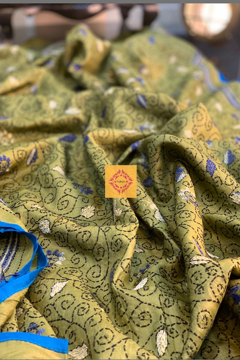 The beauty of these most loved and evergreen hand embroidered Kantha Dupattas is simply unmatched! Fabric-: Pure Tussar SilK