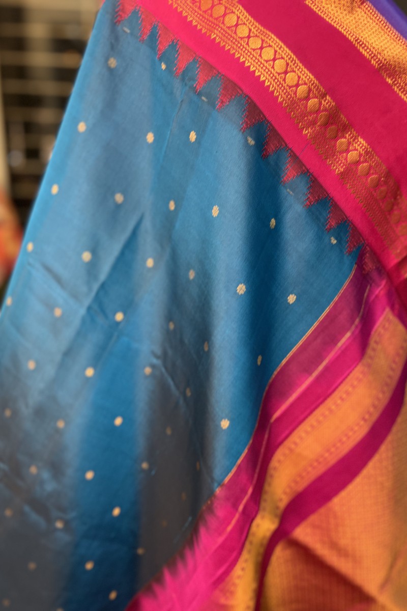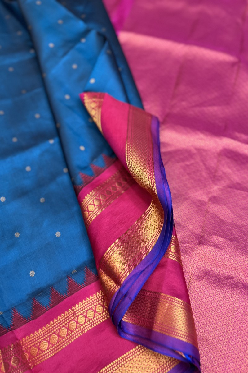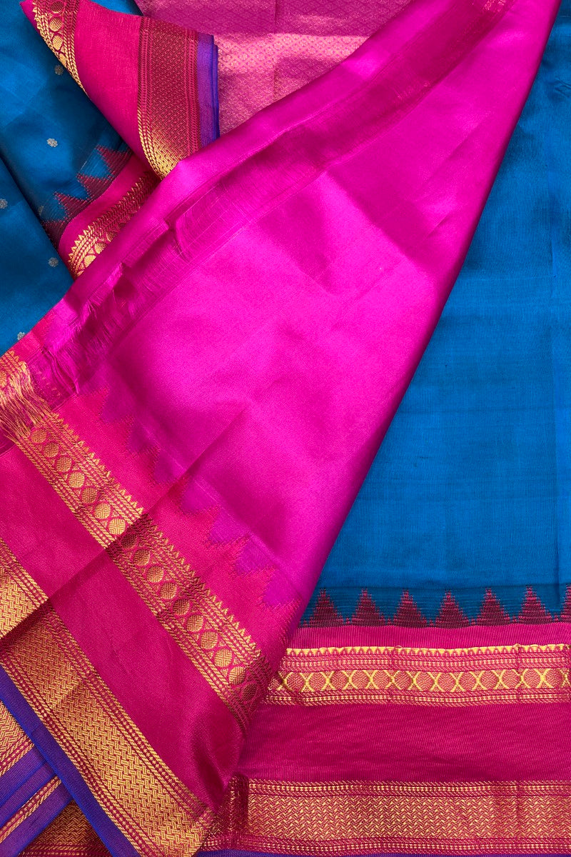 Celebrate tradition with a modern twist with this pure silk Narayanpet saree in a striking German blue hue. The vivid magenta border and pallu are enhanced with delicate zari work, creating a harmonious contrast that radiates elegance. Handwoven with meticulous craftsmanship, this saree is perfect for festive occasions, weddings, and special celebrations.