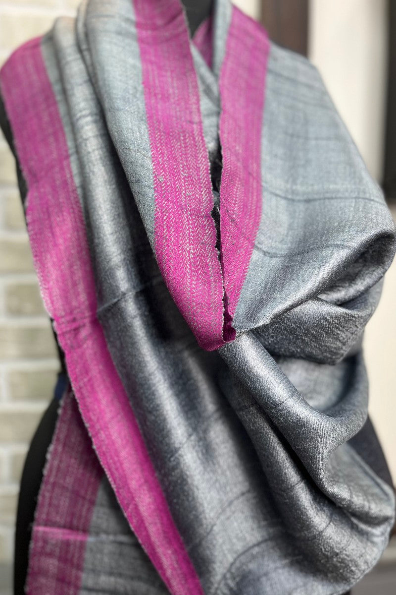 Grey Pure Tussar Silk Dupatta with Pink Border