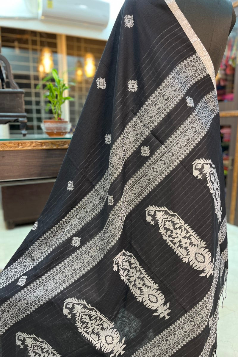 Presenting our exquisite handloom cotton Karat Border Jamdani Saree – a harmonious blend of tradition, comfort, and elegance. Handcrafted with love and dedication, this saree encapsulates the essence of Indian heritage and contemporary fashion.