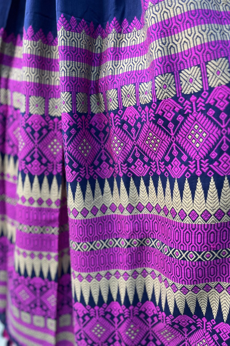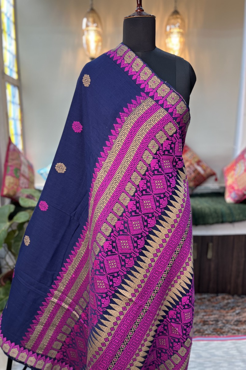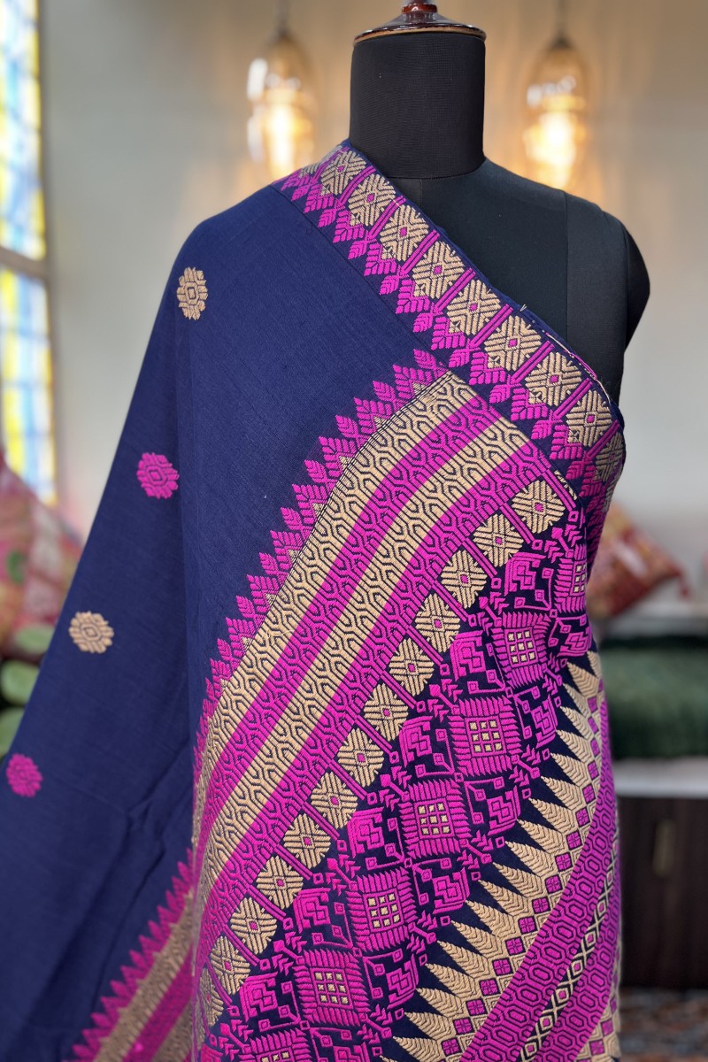 Immerse yourself in the richness of deep blue with our Assam cotton handwoven saree. This exquisite piece is a testament to the skilled craftsmanship of our weavers, featuring intricate pink tribal motifs that add a touch of ethnic charm. The saree is made from pure Assam cotton, known for its softness and durability, ensuring you not only look stunning but also enjoy absolute comfort. Whether it's a festive occasion or a casual day out, this deep blue saree with pink tribal motifs is sure to make you stand out.