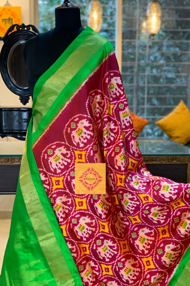 breathtaking presentation of tie-and-dye yarns creating floral inspirations and animal motifs- a Patola silk saree is a luxurious masterpiece.