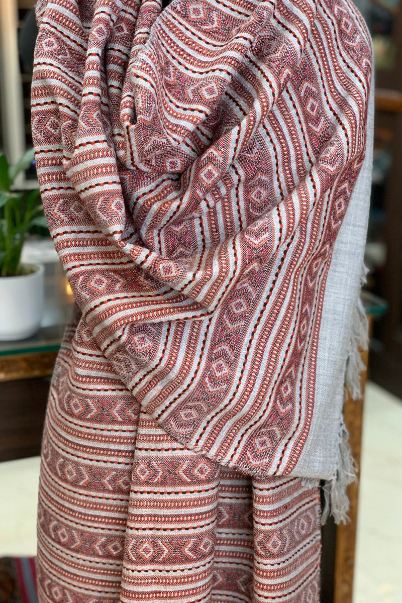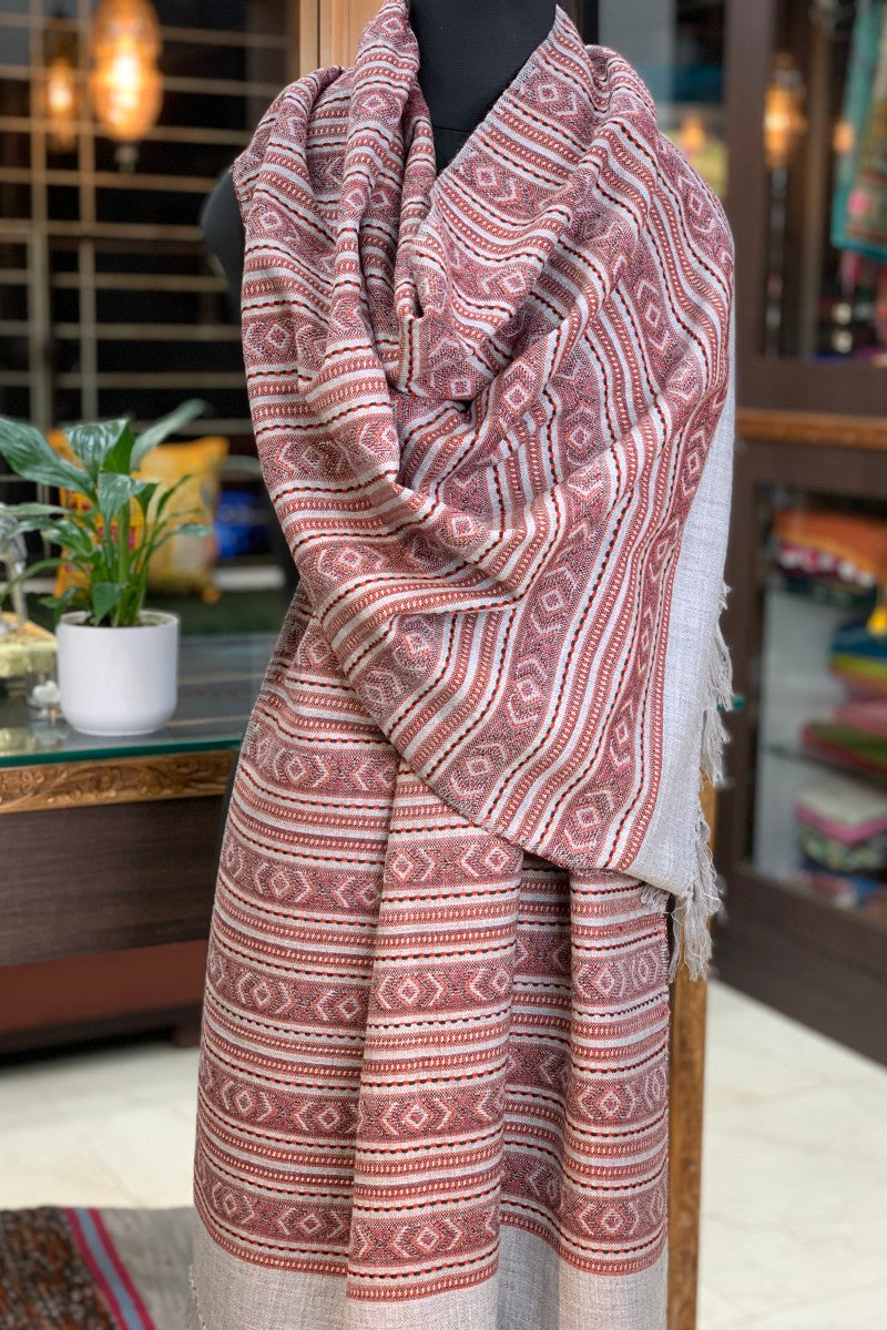 Add a touch of Himalayan charm to your wardrobe with this exquisite light grey pahadi stole. Shop now and experience the beauty of handwoven artistry.