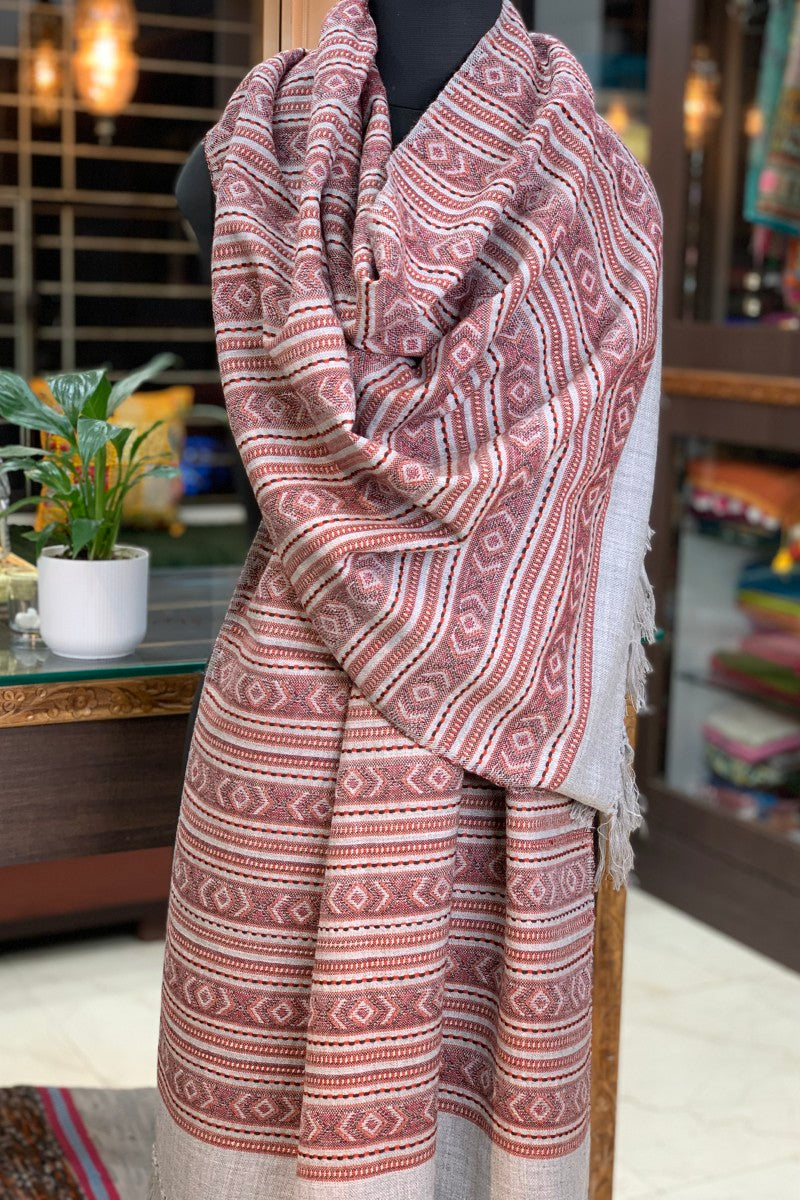 Handwoven in the heart of the Himalayas, this light greyish brown stole showcases the beauty of traditional Himachali weaving. Its vibrant red and black accents add a touch of vibrant color.