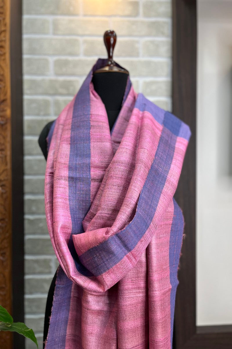 Experience the luxury of handwoven pure tussar silk with this exquisite dupatta. Bathed in a captivating shade of light orchid pink, it features captivating contrast weaving at the ends and delicate borders adorned with vibrant threads. A true testament to artisanal craftsmanship, this dupatta effortlessly elevates any ensemble with its understated elegance.