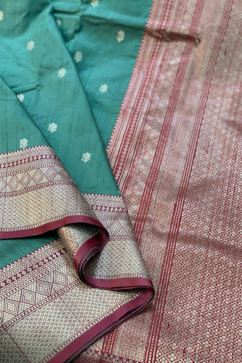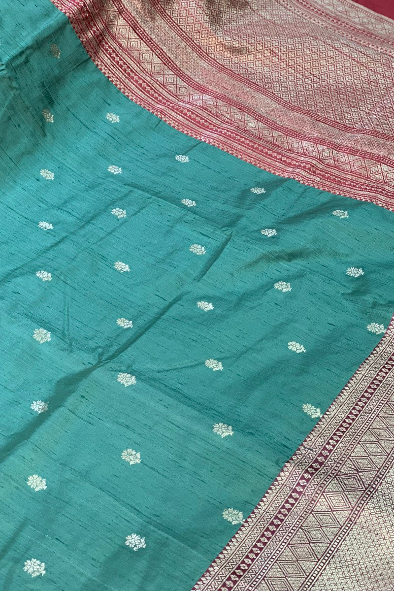 Discover the magic of handcrafted elegance with our pure raw silk teal Banarasi saree. The vibrant teal shade provides a stunning canvas for the intricate details of small Meena buttis, rendered in a charming antique golden finish. Each motif is a whisper of heritage, meticulously woven into the raw silk to offer a saree that combines the beauty of traditional Banarasi artistry with a striking, contemporary color palette.