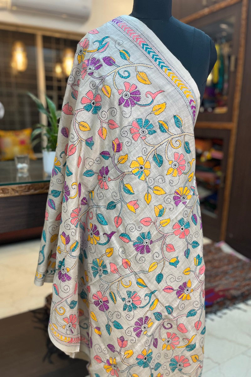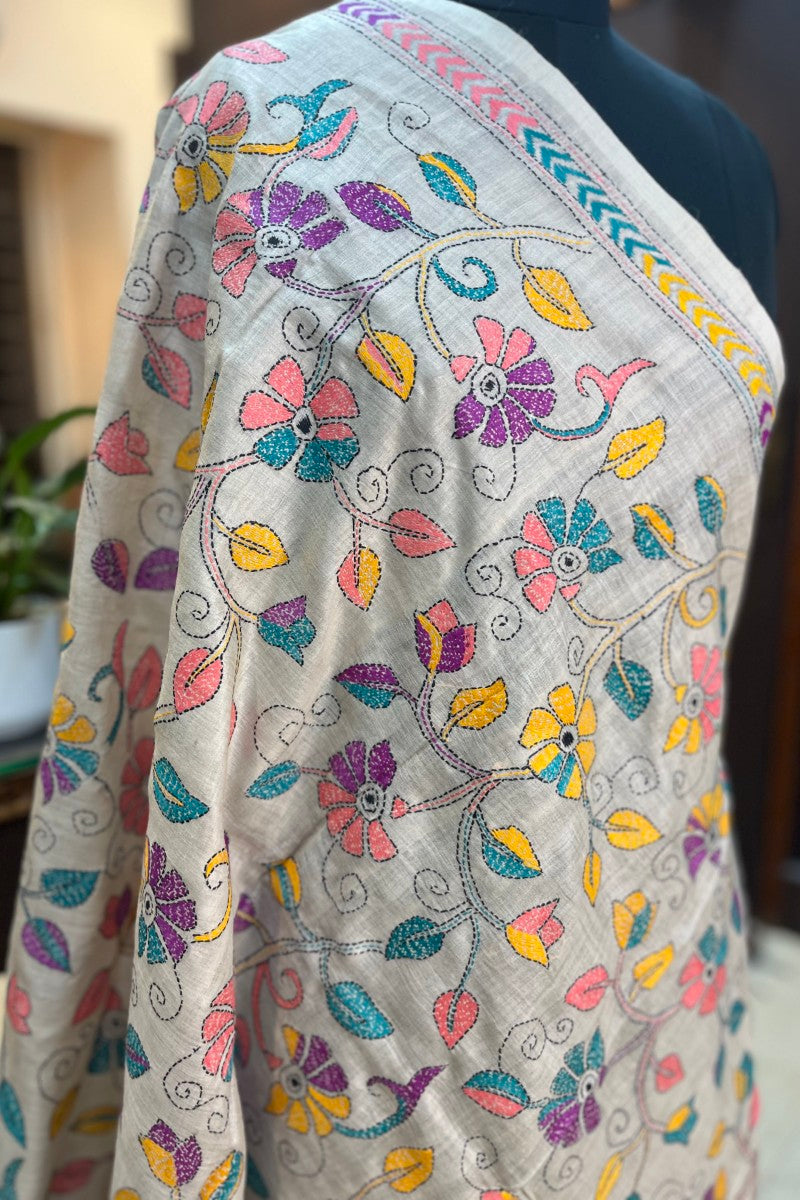 A delicate blend of elegance. This dupatta features the intricate artistry of Kantha embroidery on luxurious Tussar silk, showcasing a soft pink design against a pristine white backdrop