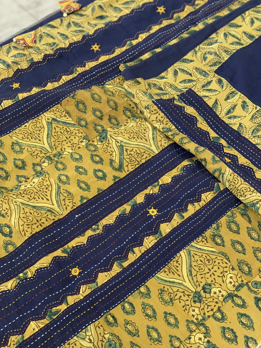 This is a special range of soft cotton Ajrakh Hand Block printed patchwork sarees with Gudri embroidery and mirror work. A Summer Story by second generation skilled artisans of Barmer, Rajasthan.