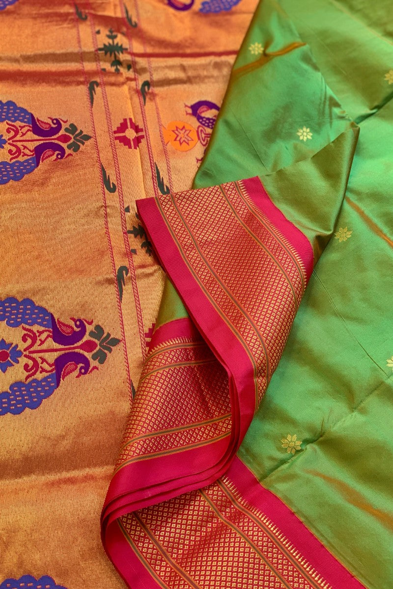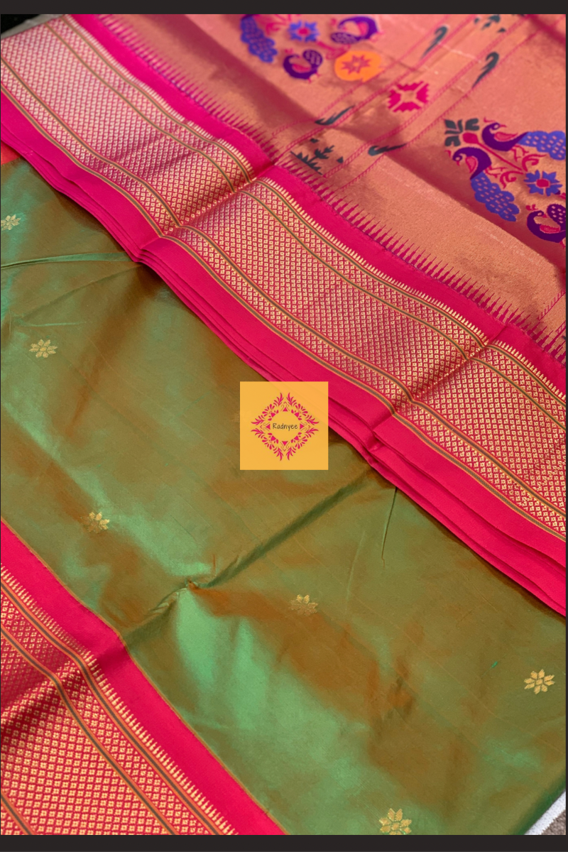 A curated range of Pure Silk Kadiyal Paithani Sarees. the Magnificence of these sarees will lure you forever. Made-: Powerloom, Fabric-: Pure Silk 4 ply, Pallu- Kadiyal