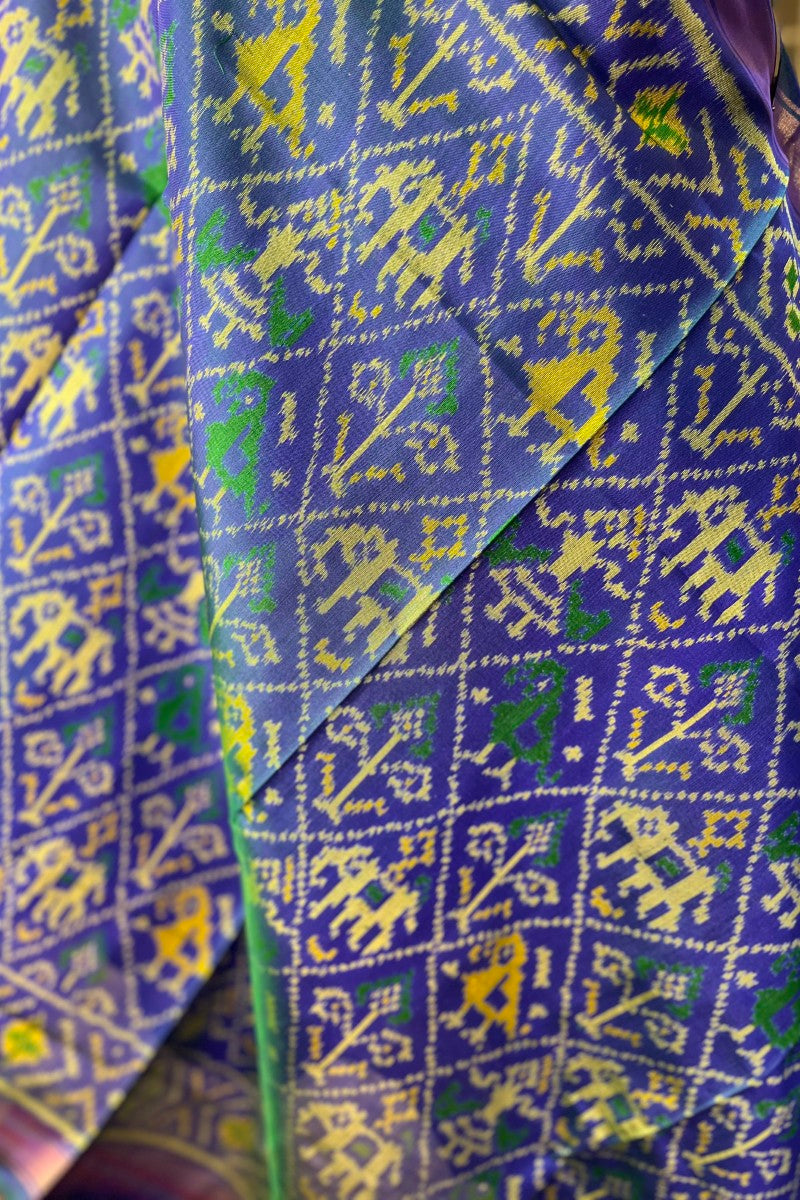Immerse in the depth of our peacock blue pure silk Rajkot Patola dupatta, a testament to timeless elegance and craftsmanship.