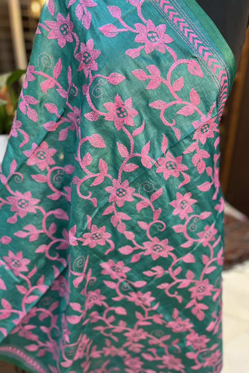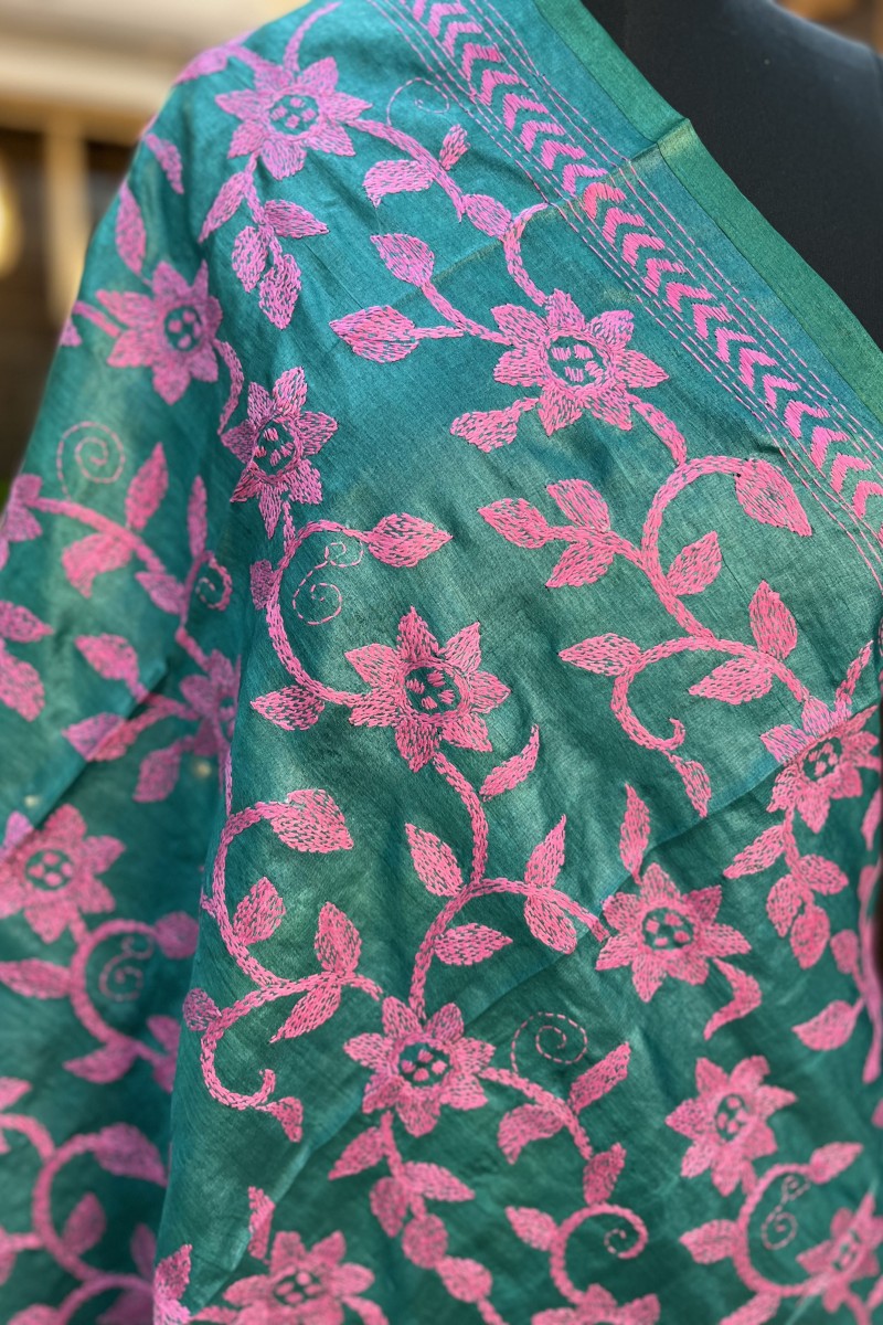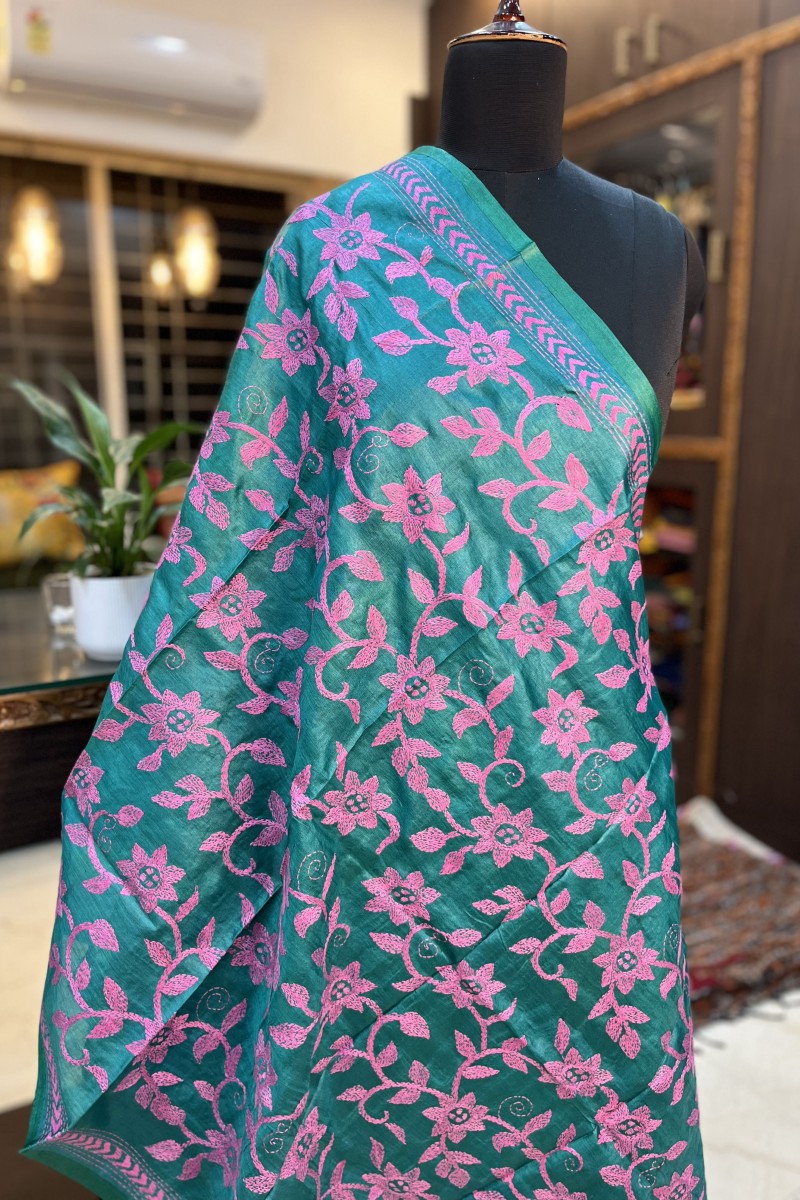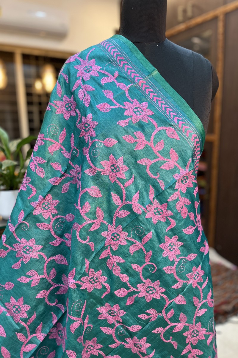 Artisanal Peacock Blue Pure Tussar Silk Kantha Dupatta with Pink Motifs: Each stitch of this dupatta reflects the rich tradition of Kantha embroidery. The vibrant pink motifs, hand-crafted on a deep peacock blue base, highlight the natural beauty of Tussar silk.