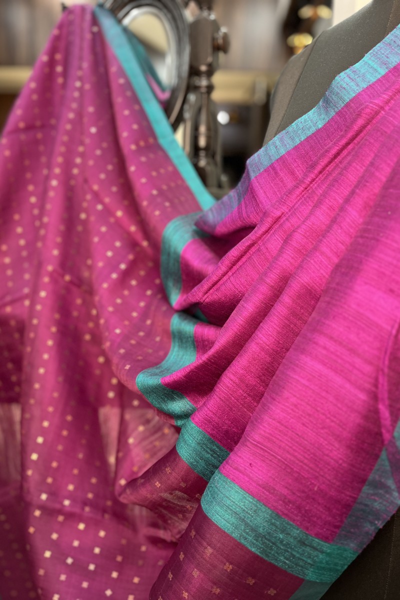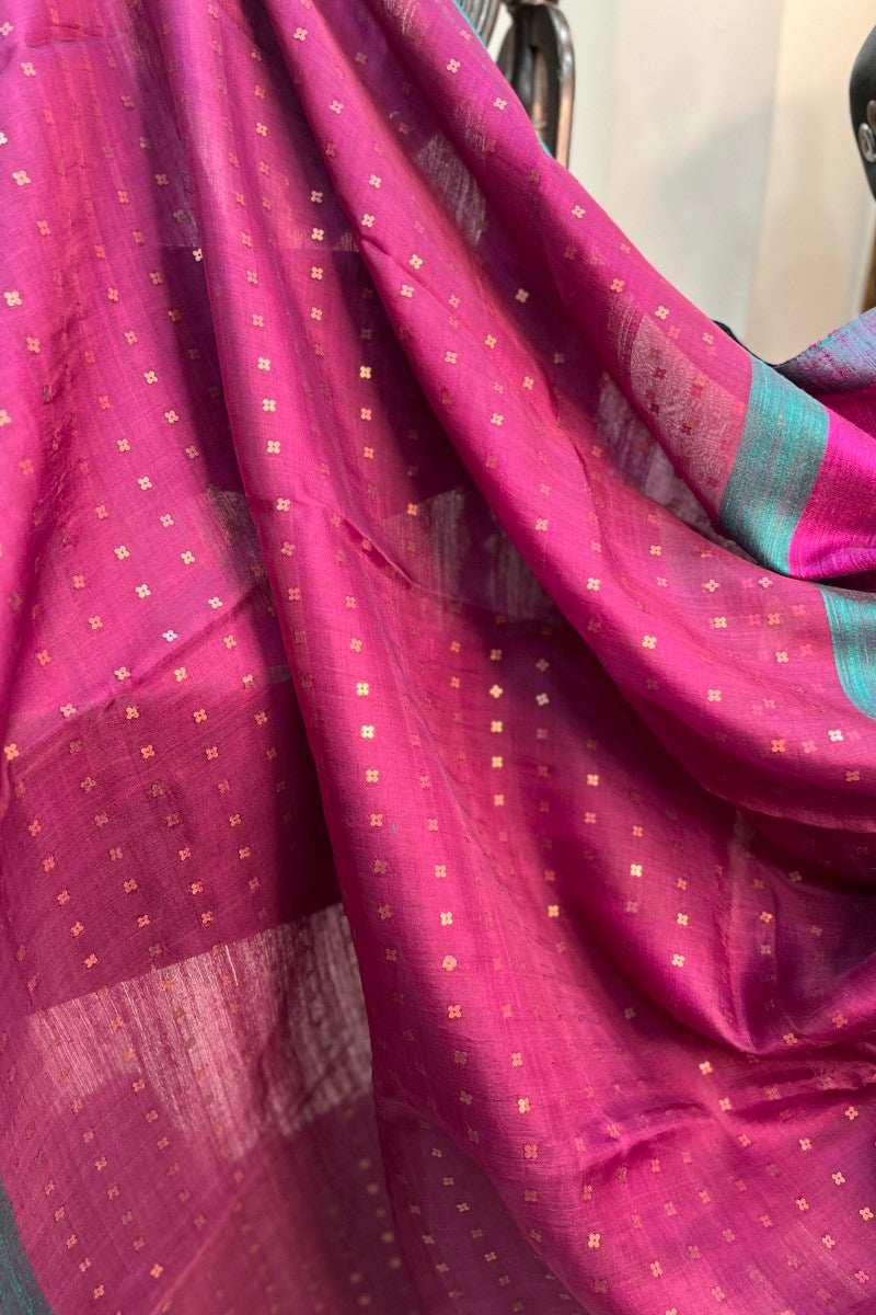 Grace your occasion with this Pink-Purple Pure Matka Silk Saree, featuring a striking contrast blue border. The sequins-adorned pallu adds a subtle sparkle, enhancing the natural texture and sheen of handwoven Matka silk.
