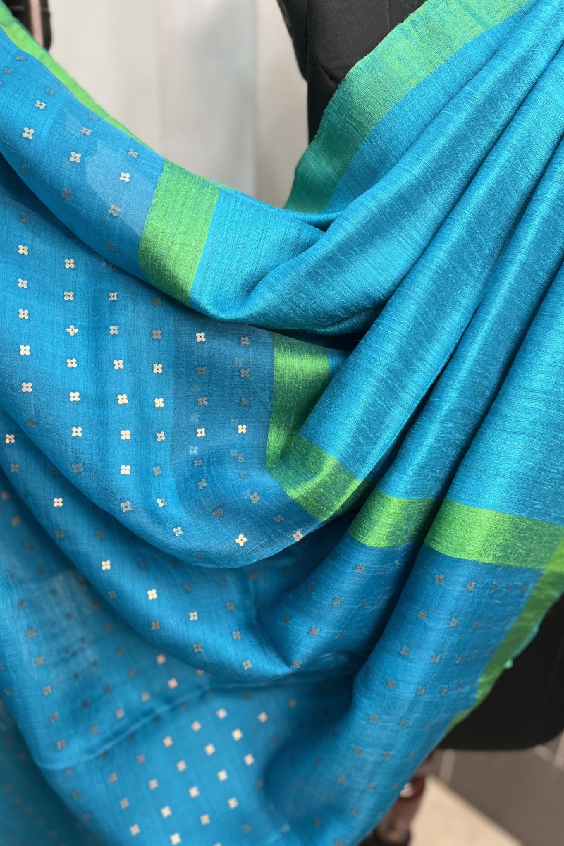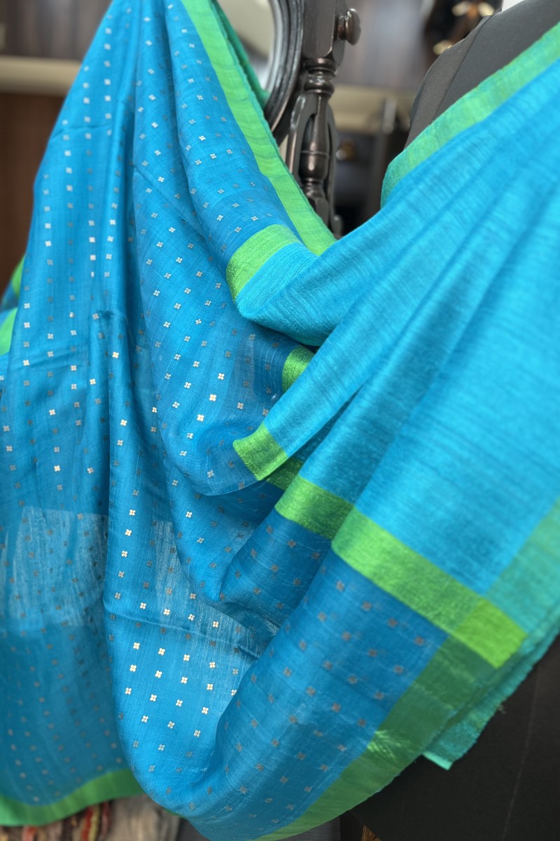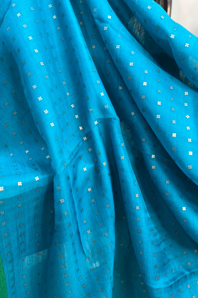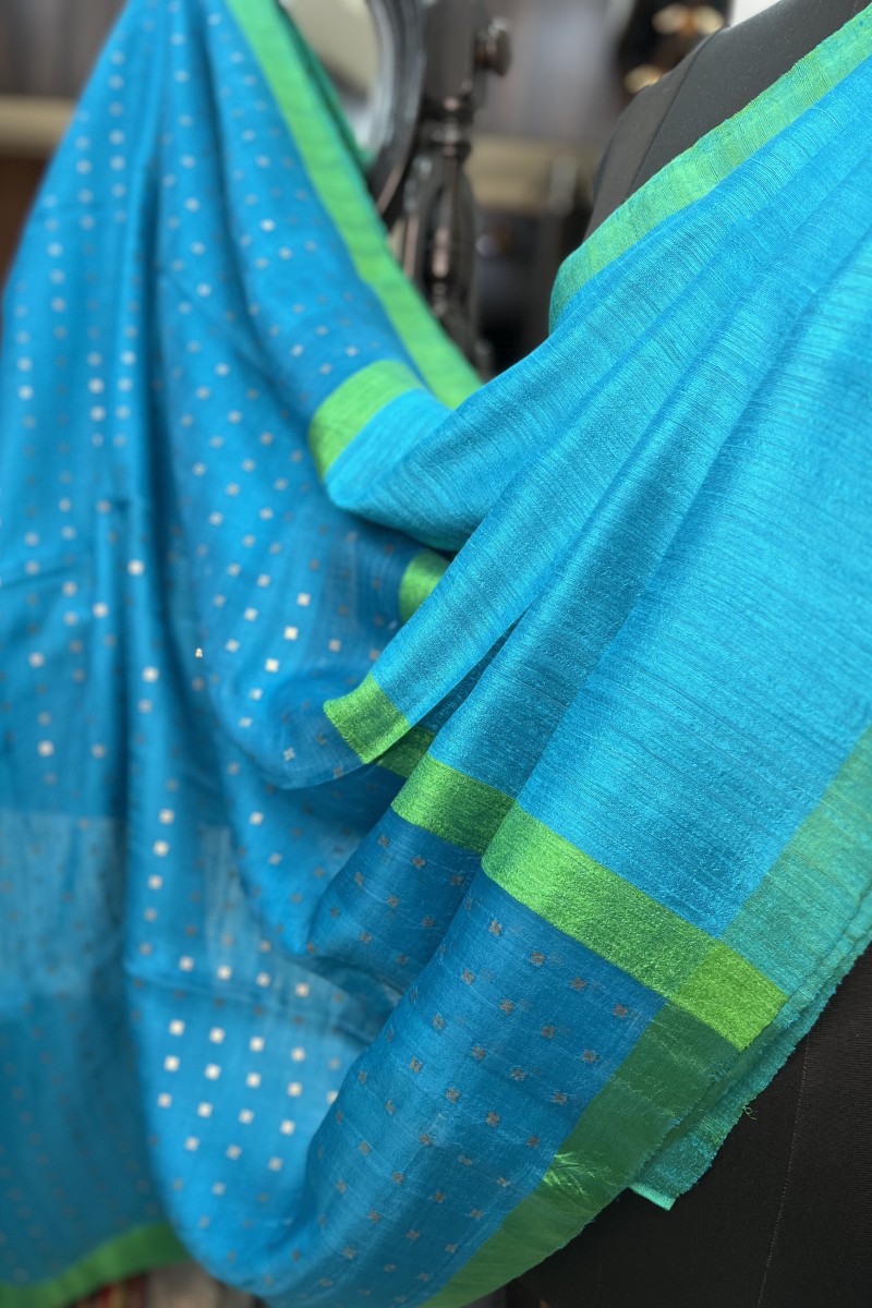 Experience the charm of handcrafted luxury with this Pure Matka Silk Handloom Saree in Firozi Blue. The contrast green border and intricately woven sequins on the pallu and blouse create a graceful fusion of color and shimmer.