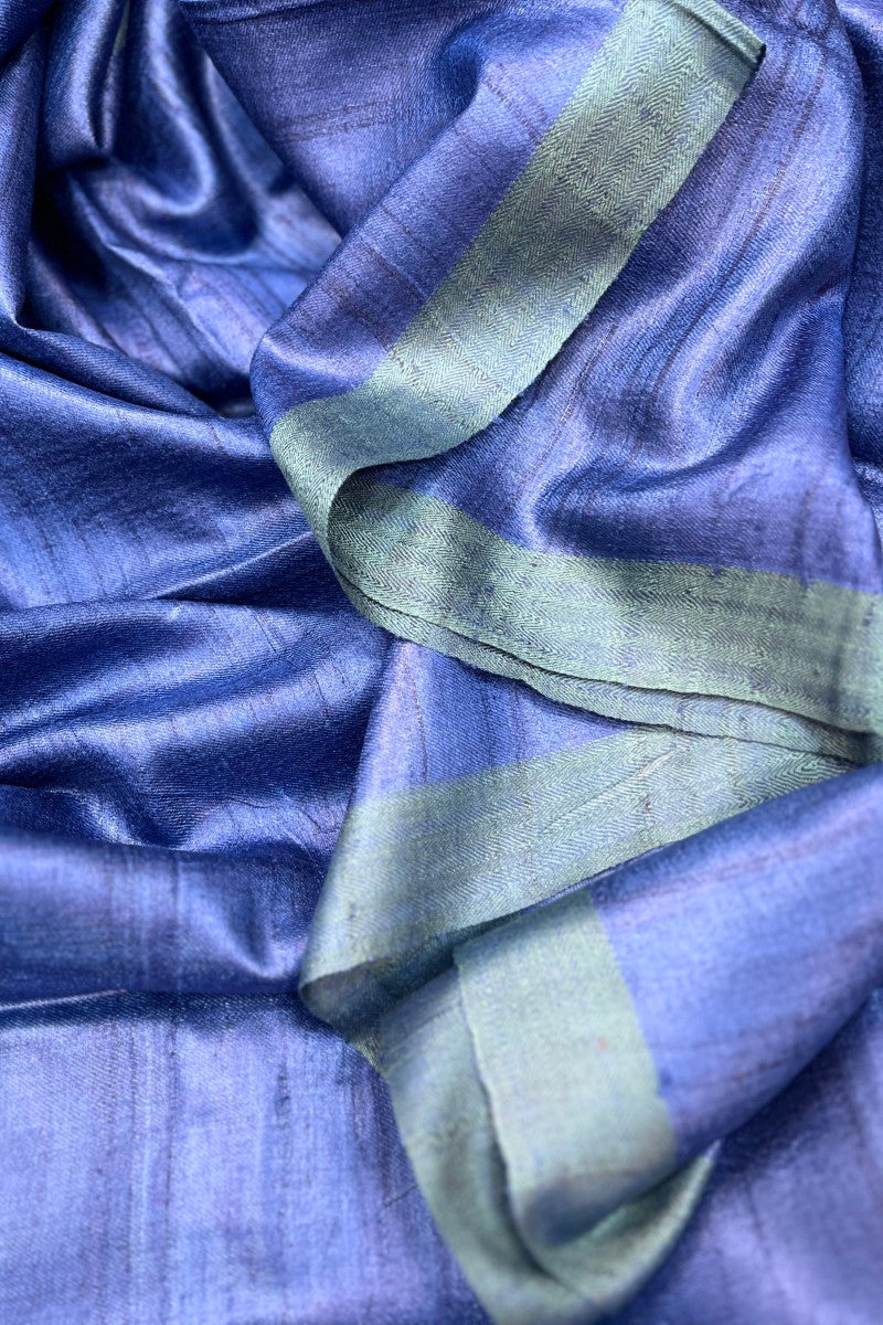 Embrace timeless tradition with this pure Tussar silk saree. A stunning shade of blue drapes elegantly, while the vibrant green pallu and border add a pop of contrast, making this a truly captivating piece for any special occasion.