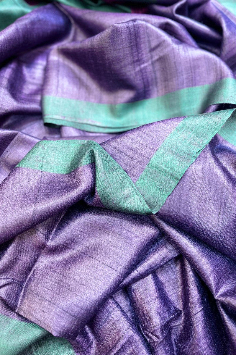 Drape yourself in elegance with this pure Tussar silk saree, a captivating blend of light purple and rich green. The shimmering body in a soft lilac hue is perfectly complemented by a traditional green pallu and border, creating a timeless look that's perfect for any occasion.
