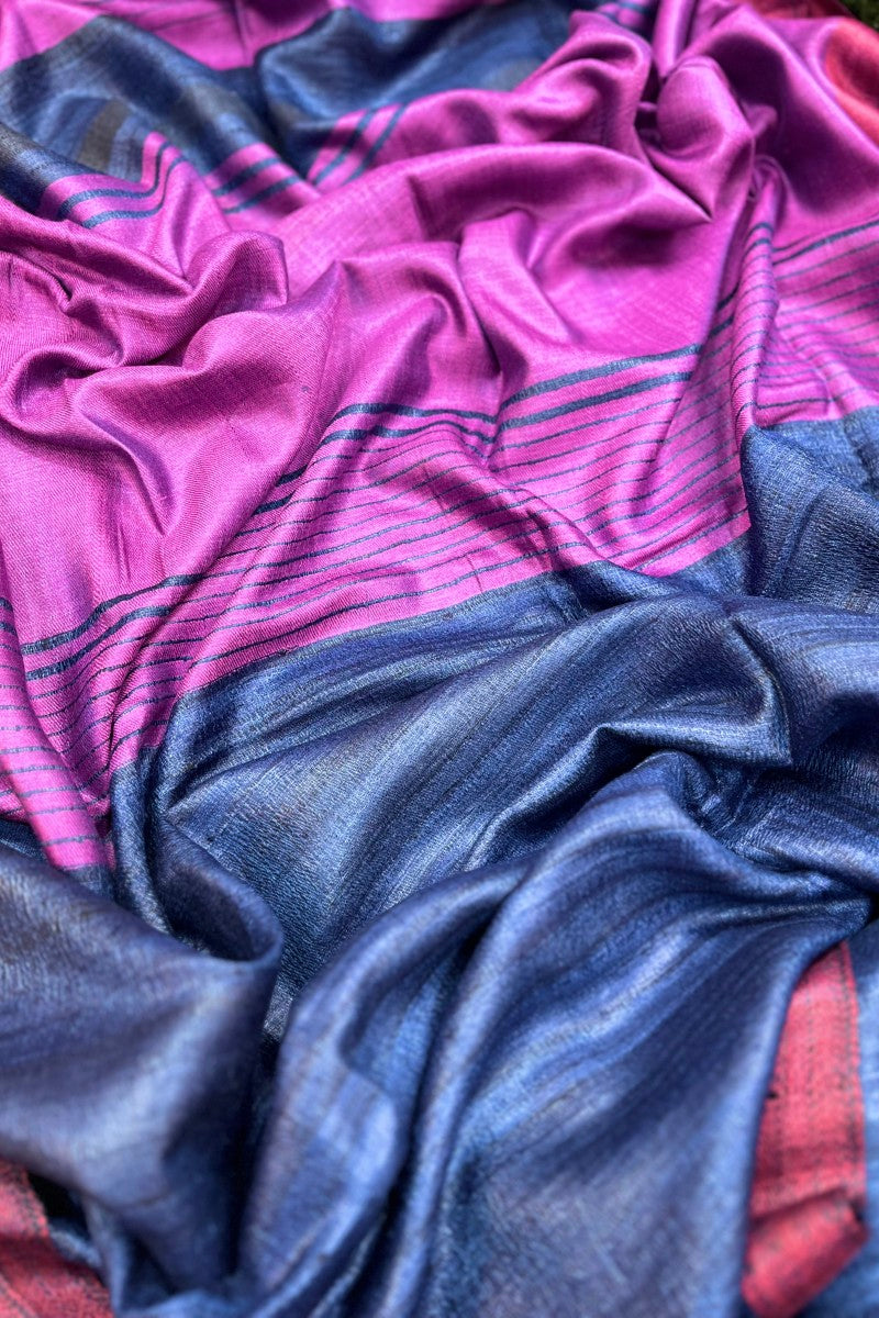 A striking classic. Our handwoven pure Tussar silk saree pairs a rich midnight blue with a pop of magenta on the pallu and border. A lightweight and elegant drape, perfect for any special occasion.