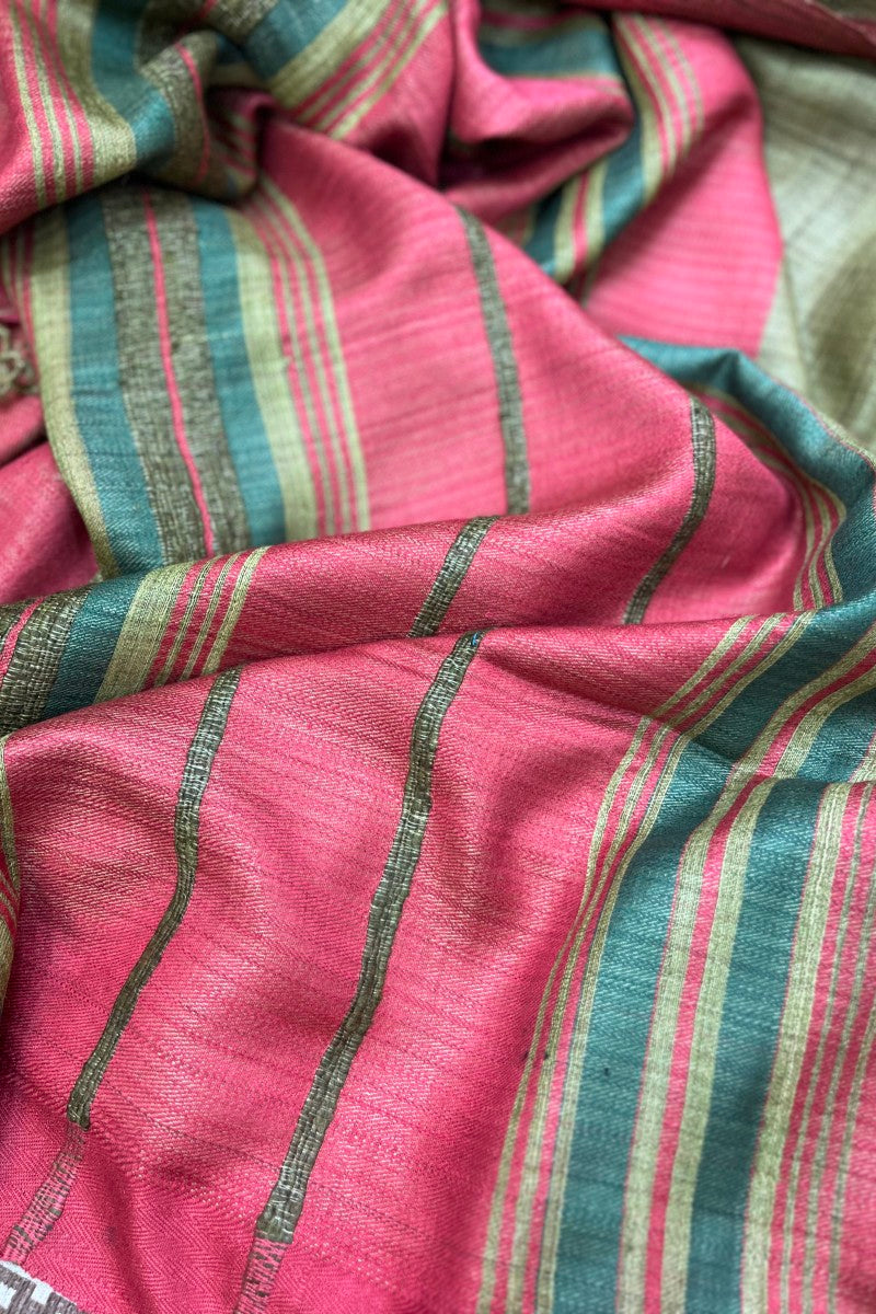Drape yourself in nature's artistry. This pure Tussar silk saree in a vibrant parrot green hue is beautifully contrasted with a striking orange border and pallu, making it a perfect blend of tradition and modern elegance.