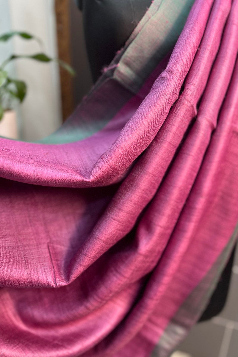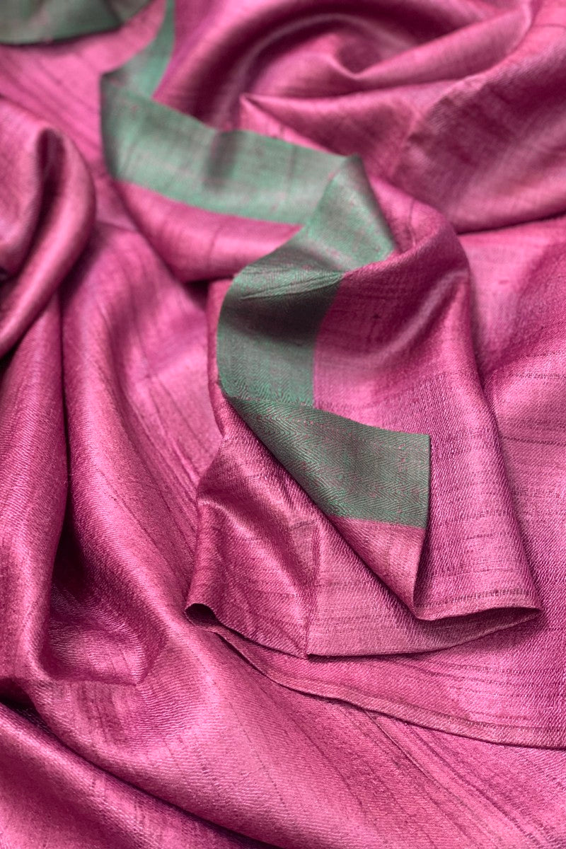 Wrap yourself in timeless grace with this exquisite Pure Tussar Silk saree. The soft pink body, a canvas of elegance, is beautifully complemented by a vibrant green pallu and border, creating a striking and sophisticated contrast. Perfect for any special occasion, this saree is a testament to traditional artistry and modern style.