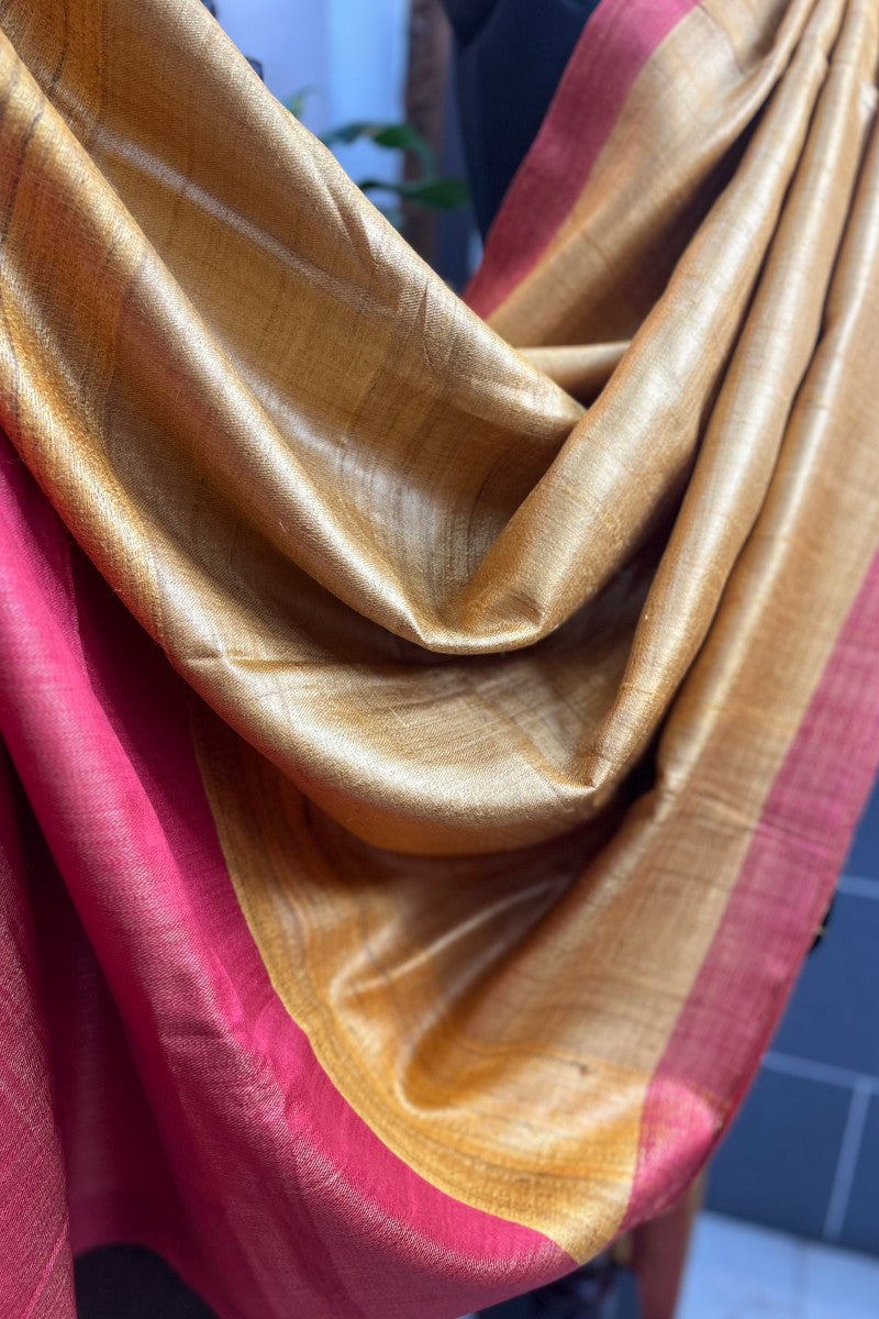 This pure Tussar silk saree in a sunny yellow shade is beautifully accentuated by a rich orange pallu and border, bringing a touch of warmth and vibrancy to your wardrobe.