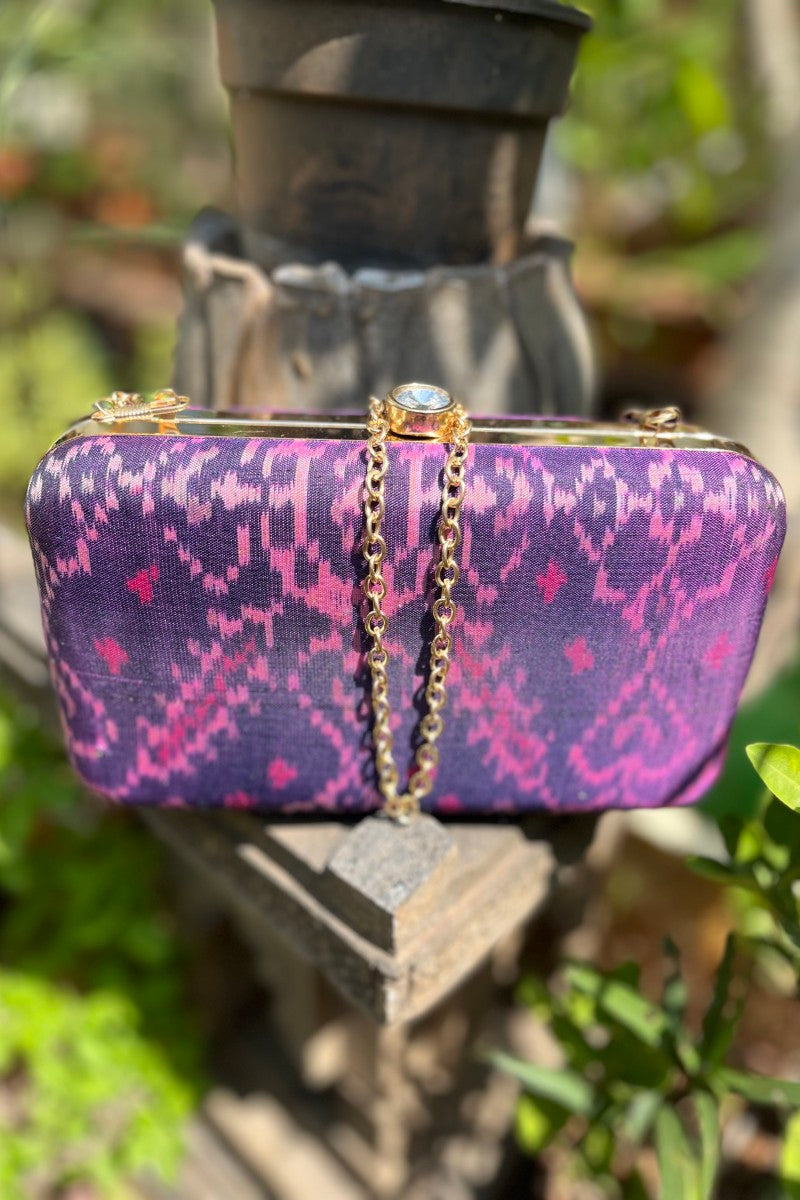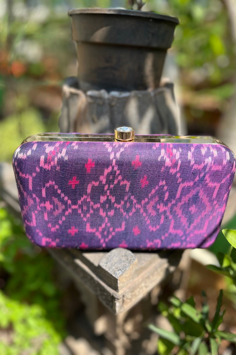 Regal Purple Rajkot Patola Silk Clutch: Indulge in the luxurious feel of pure silk with this stunning clutch. Its deep purple hue and intricate Rajkot Patola weaving make it a truly elegant accessory