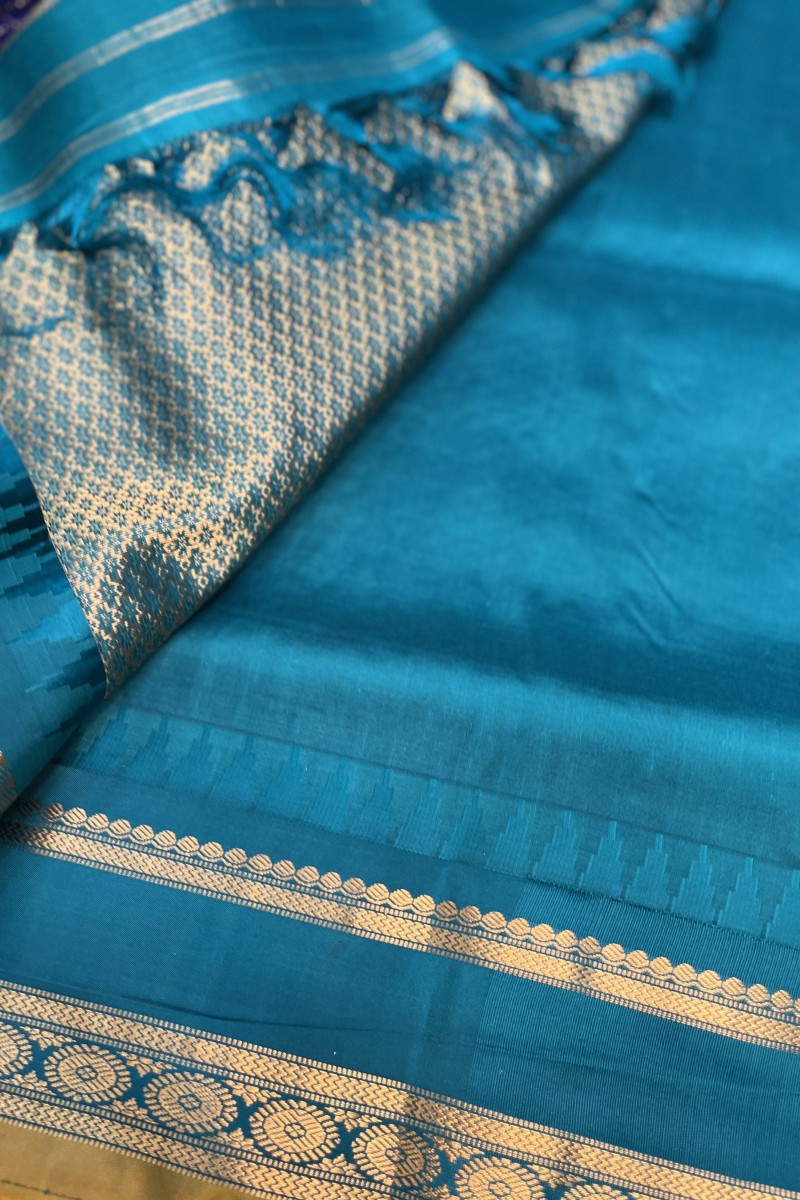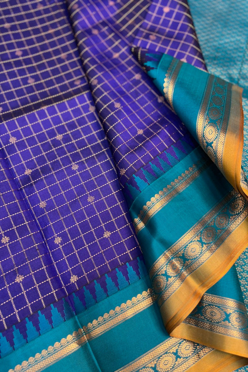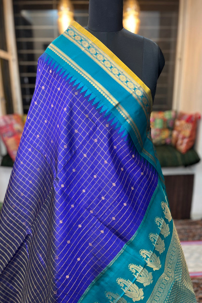 Step into a world of luxury and tradition with this handloom Narayanpet saree in a regal purple hue. The delicate checkered zari motif adds subtle shimmer and dimension, while the Firozi contrast border and pallu create a striking visual harmony. Each saree is meticulously handwoven, making it a perfect choice for festive celebrations, weddings, and cherished occasions. Its soft, flowing drape ensures comfort without compromising on grandeur.