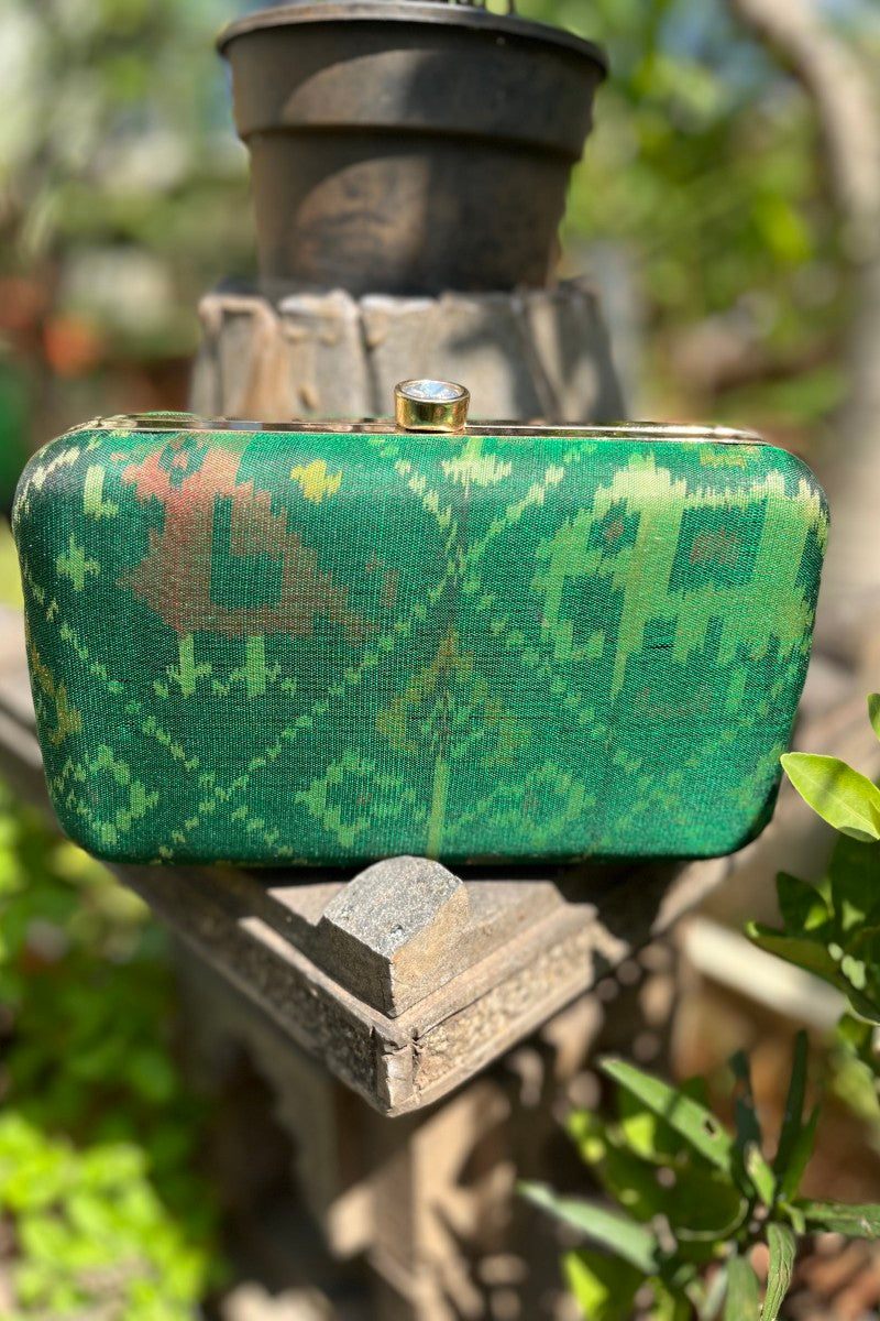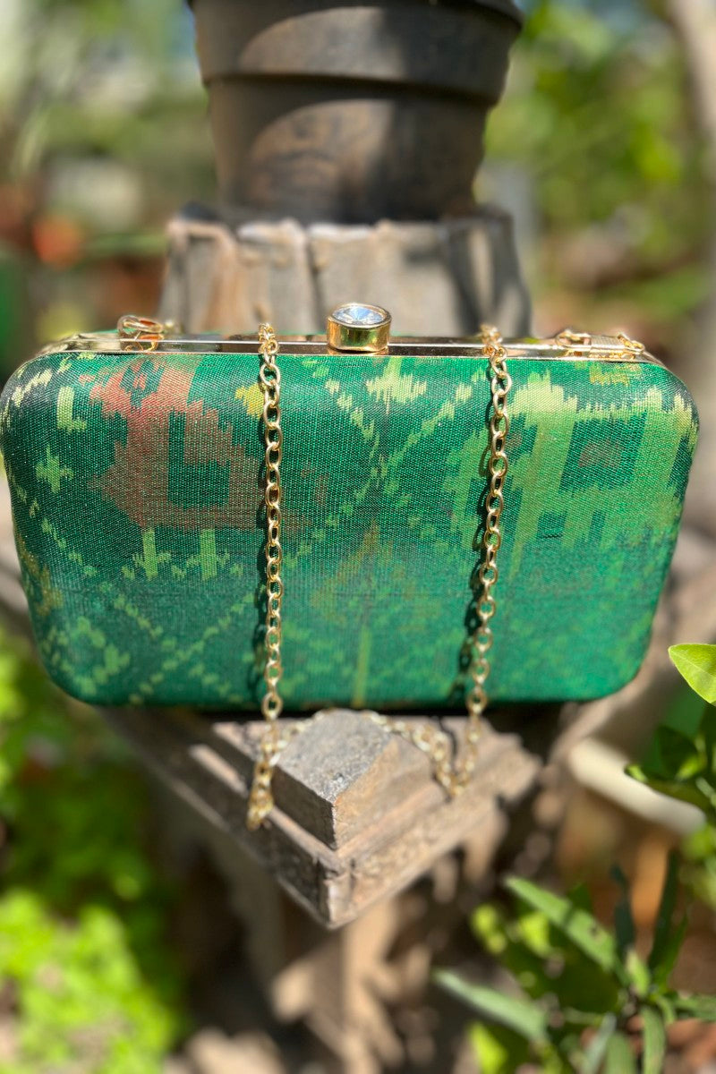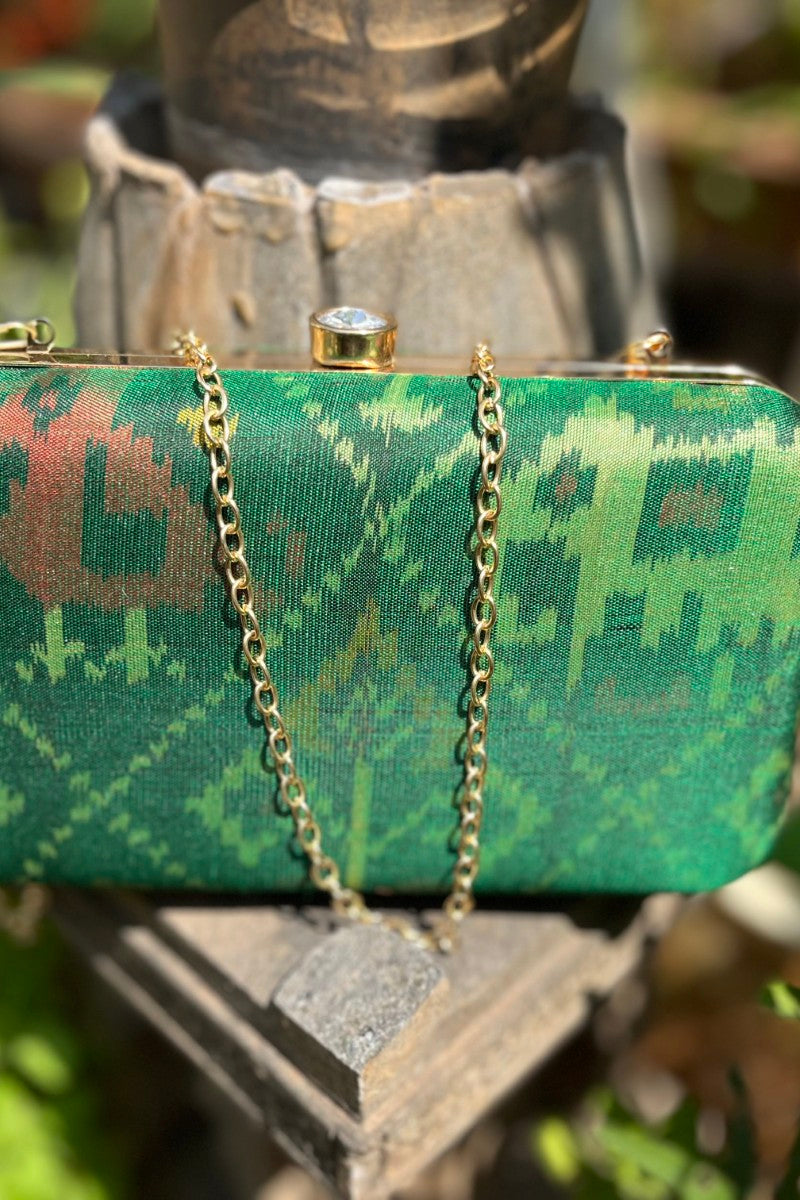 Classic Green Rajkot Patola Silk Clutch: Embrace timeless elegance with this traditional green clutch. Crafted from pure silk, it showcases the intricate hand-woven Patola designs of Rajkot.