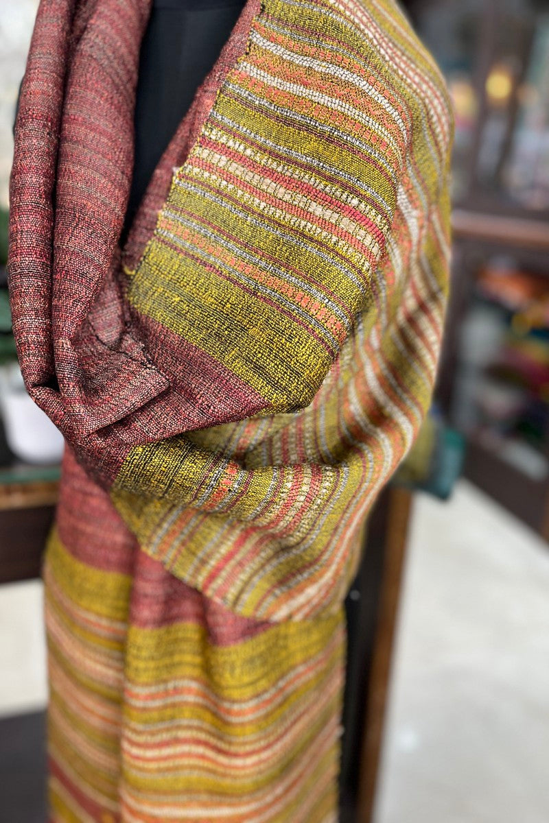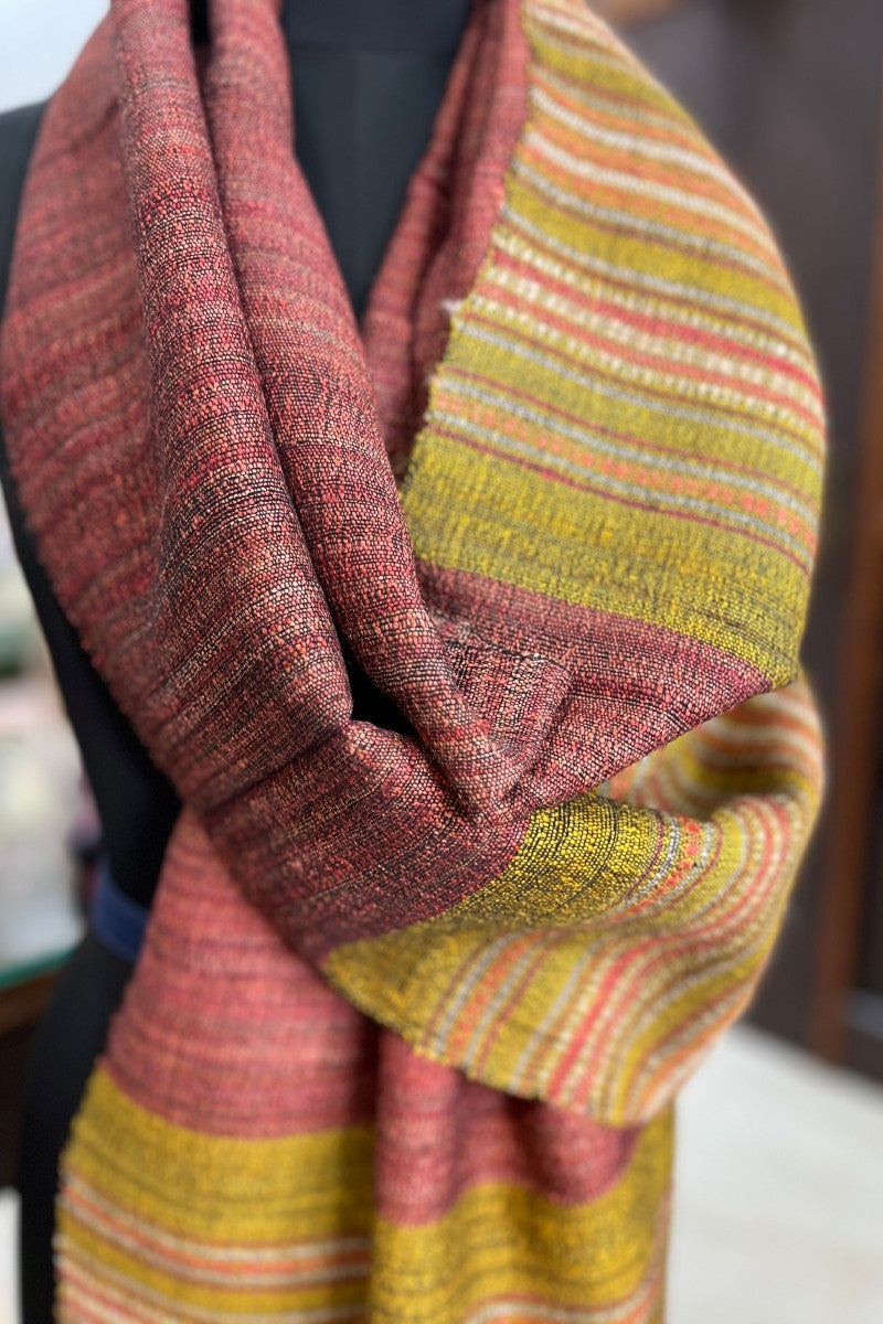 This captivating carrot red Bhujodi stole features a mesmerizing display of green intricate weaving. A perfect blend of tradition and elegance, this piece is sure to elevate any ensemble