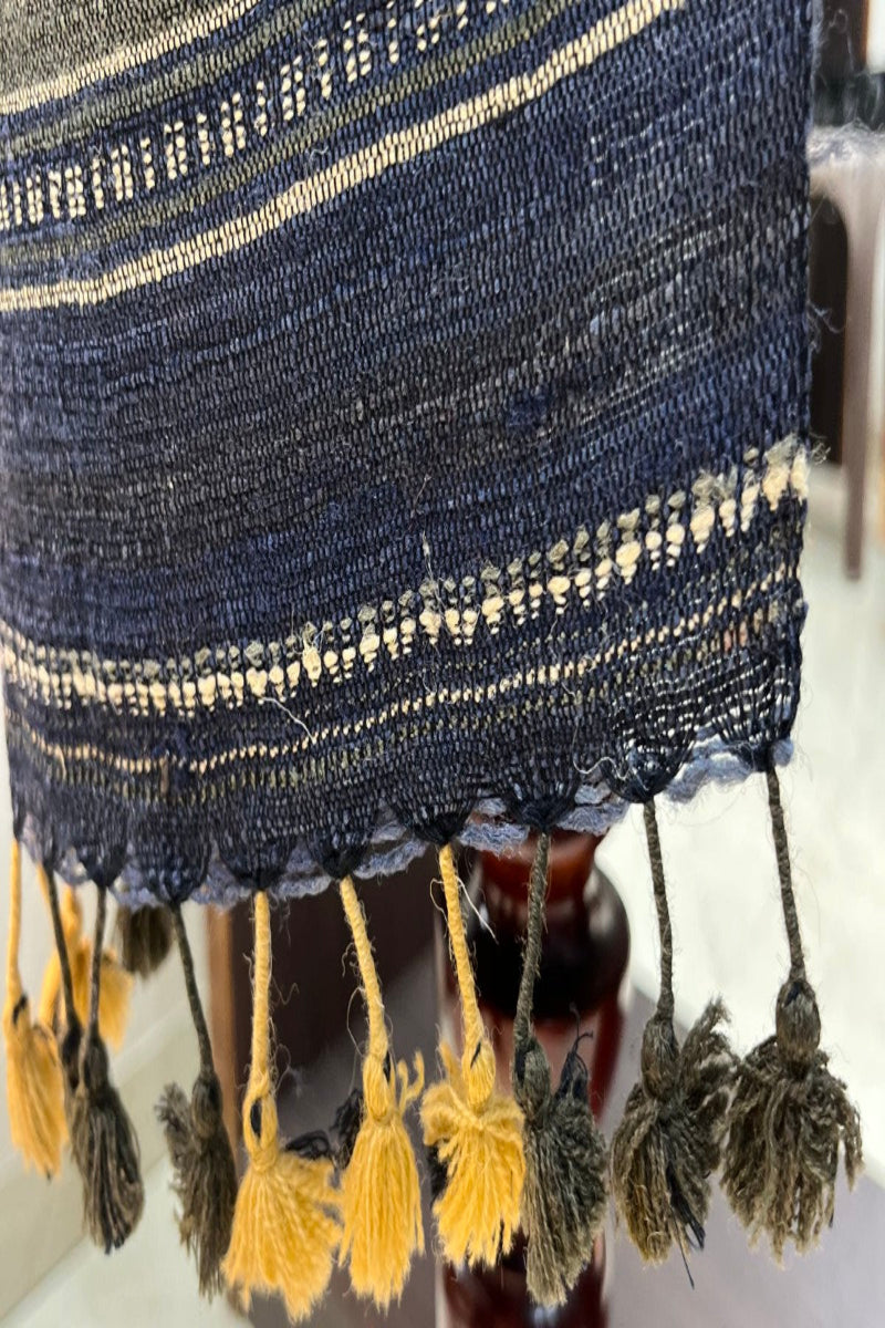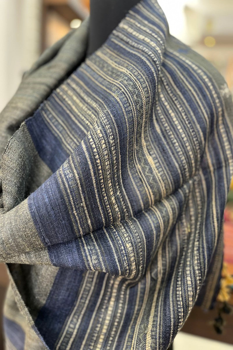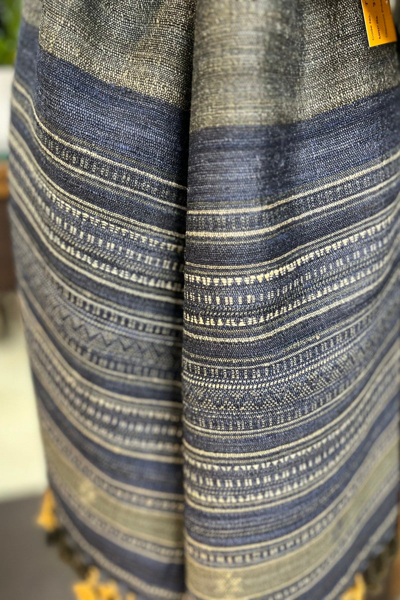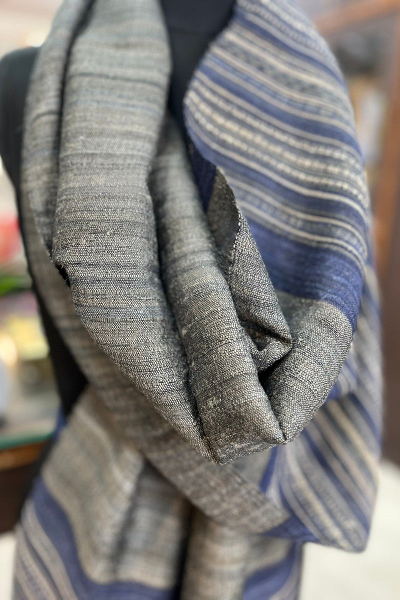 Elevate your style with this unique Bhujodi stole. The blend of earthy greenish grey and intricate grey weaving creates a stunning visual appeal. This versatile piece can be draped effortlessly over any outfit, adding a touch of bohemian chic
