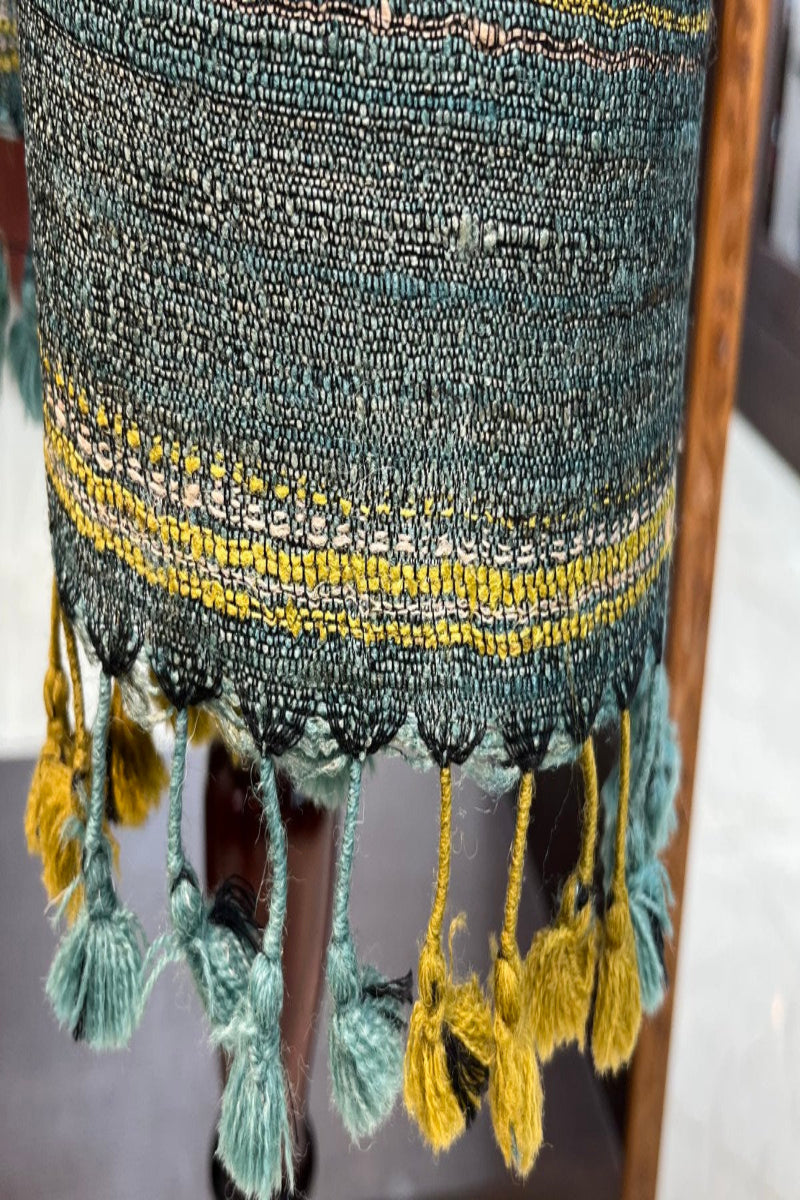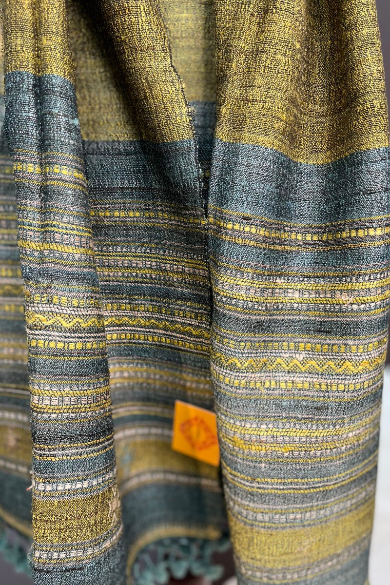 Experience the artistry of Bhujodi with this stunning stole. Handwoven in a captivating blend of greenish mustard and vibrant firozi, it features intricate weaving that showcases the skill and tradition of the artisans.