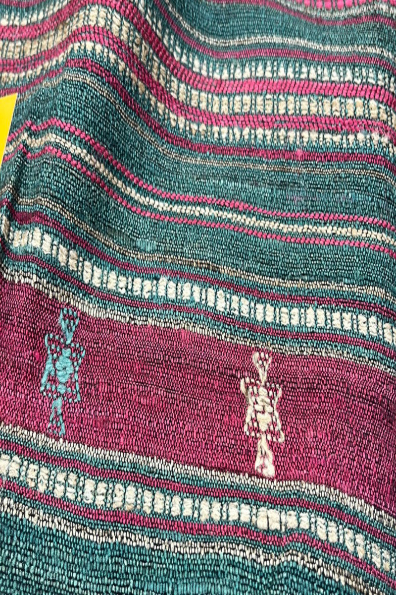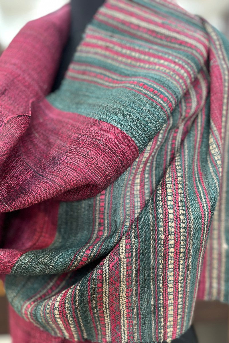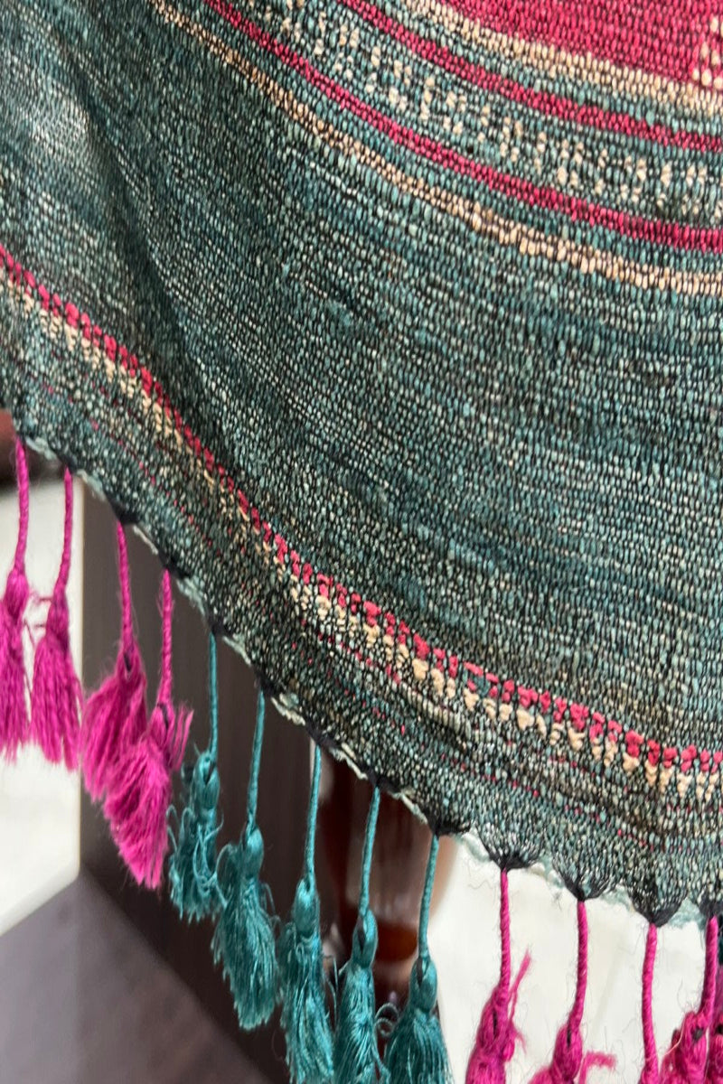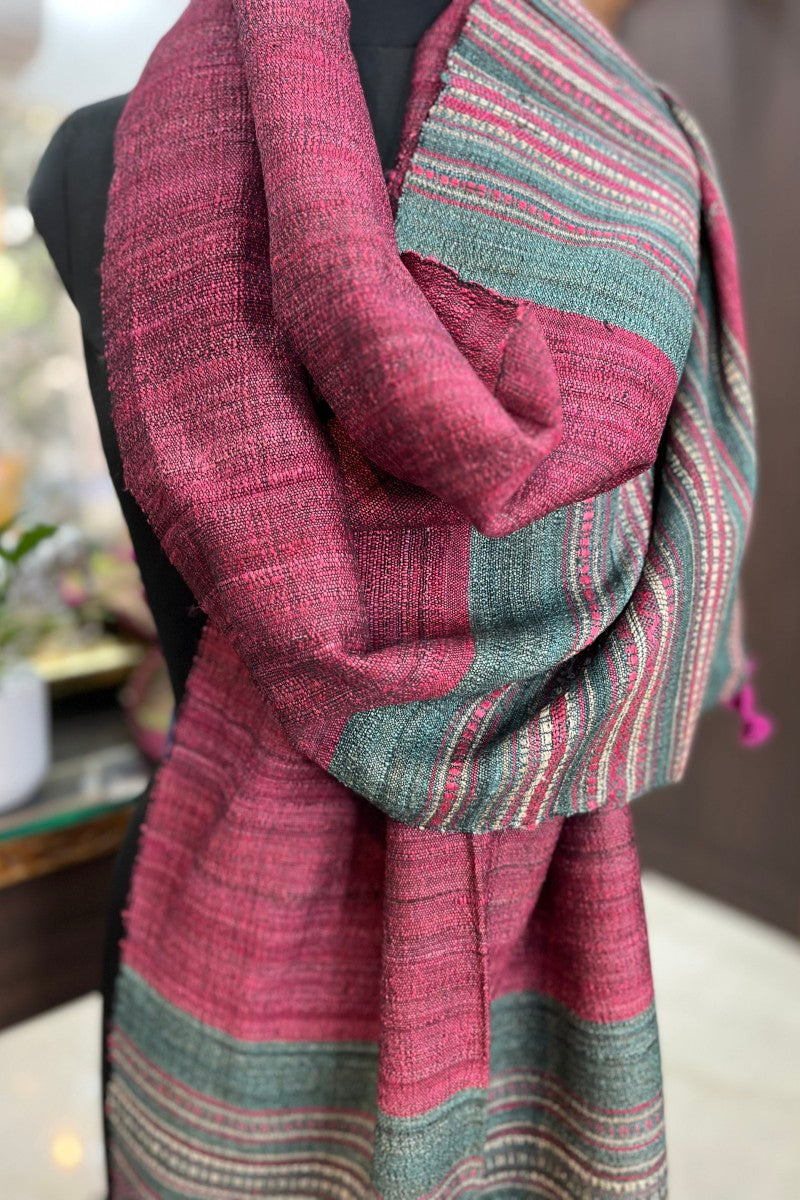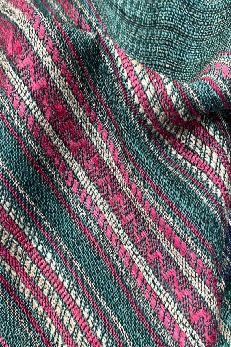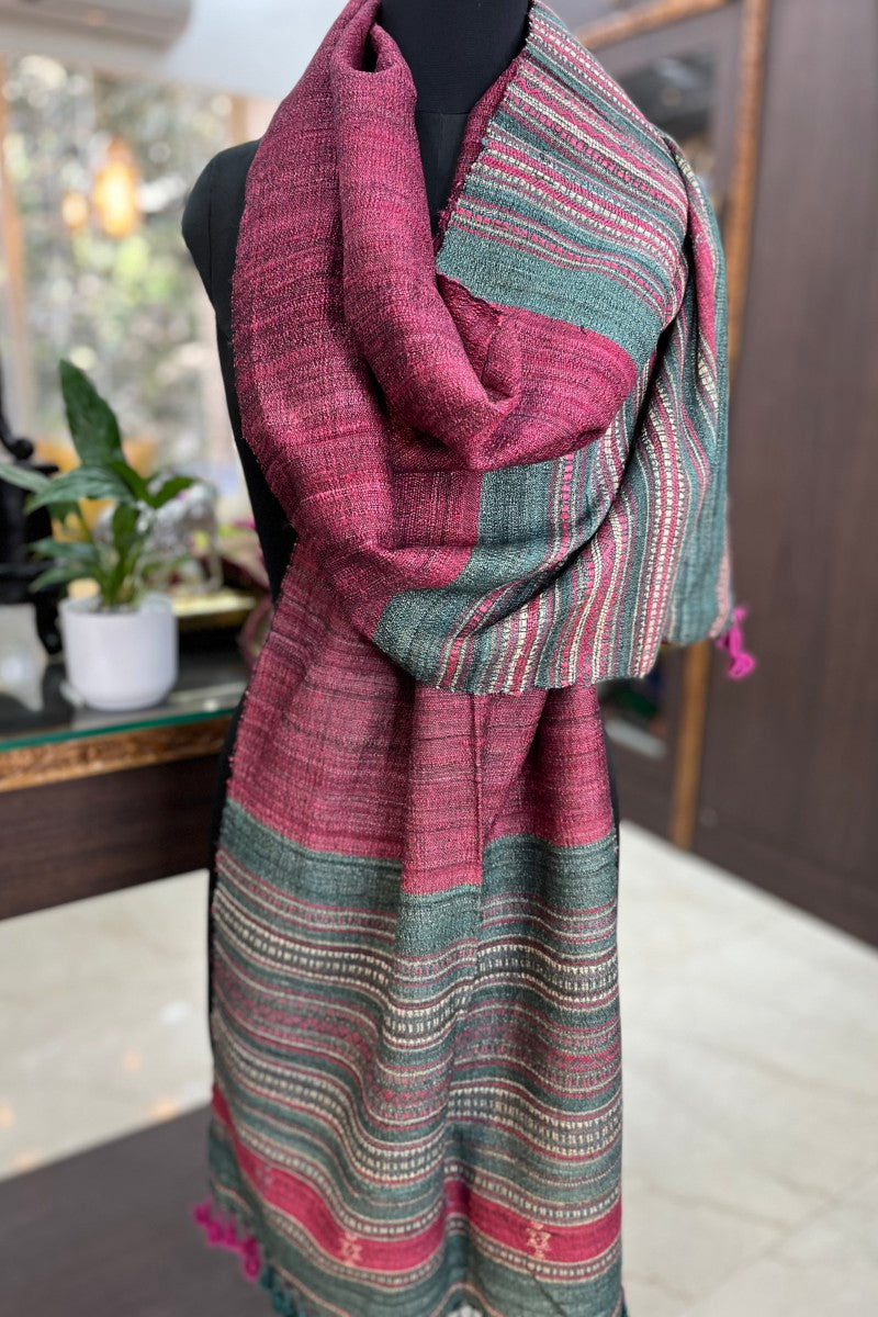 This Magenta Bhujodi Stole is a masterpiece of traditional craftsmanship. The rich magenta hue is beautifully complemented by the intricate teal green woven patterns, creating a visual symphony. Drape this exquisite piece over any outfit to add a touch of elegance and sophistication.