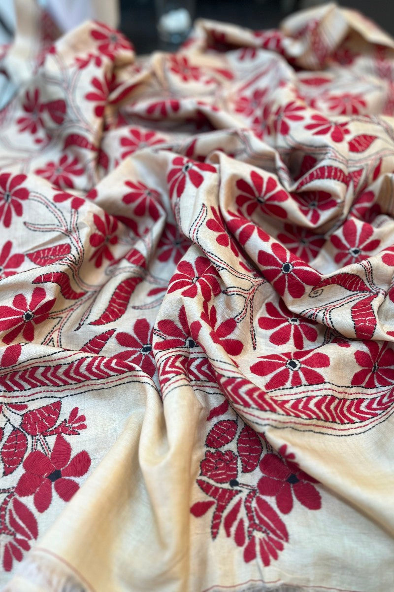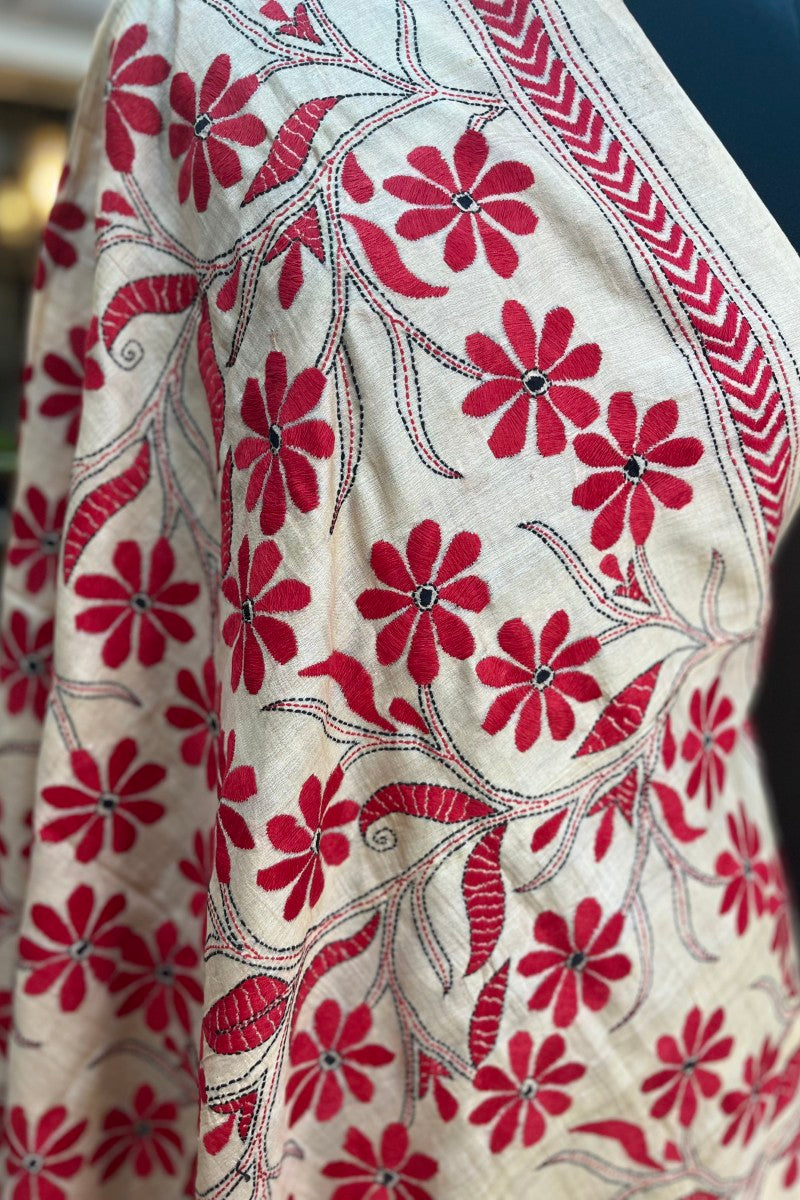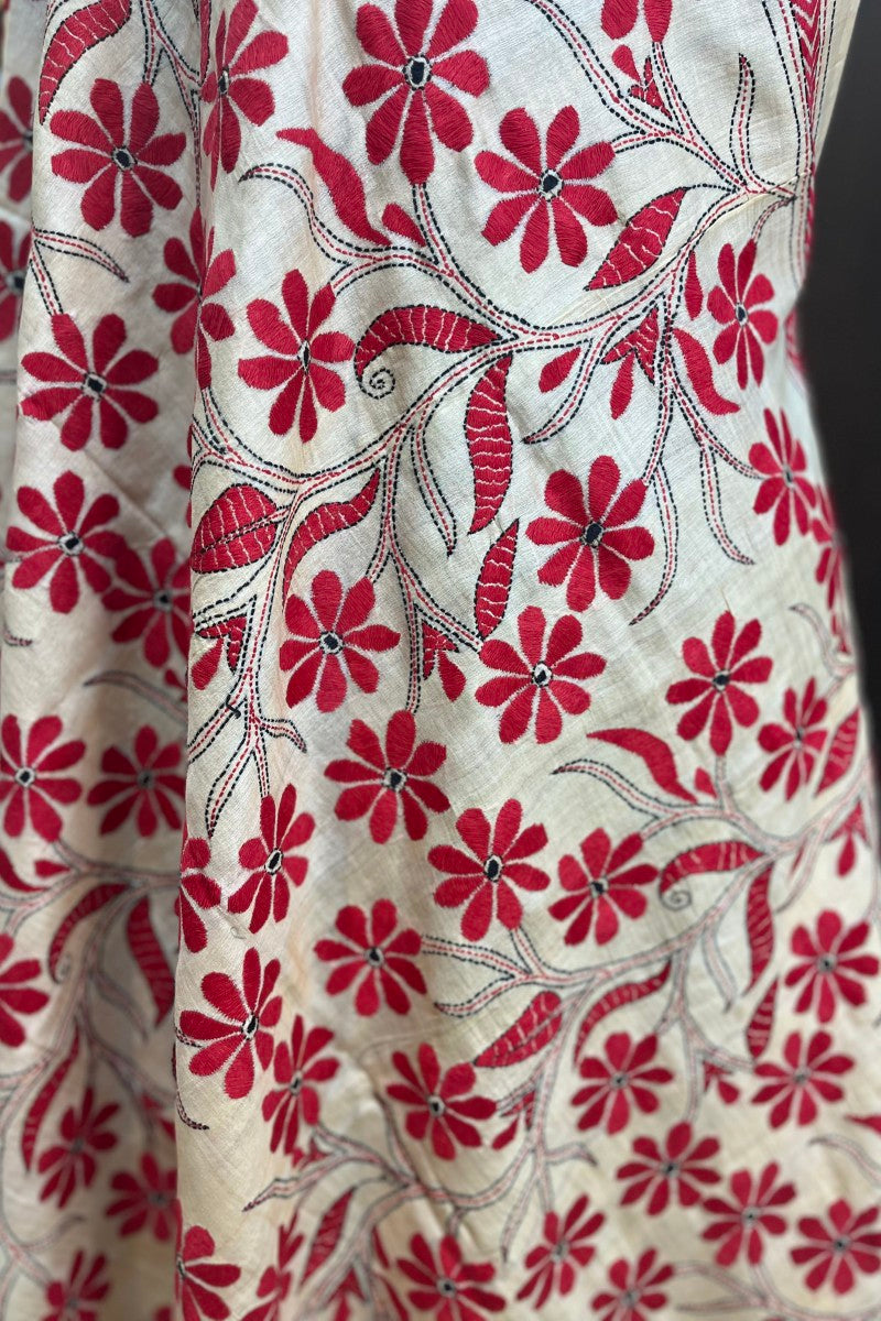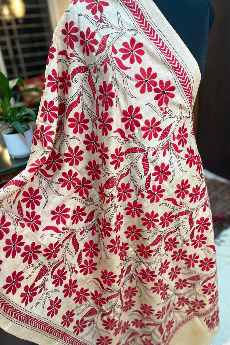 Elegant White and Red Pure Tussar Silk Kantha Dupatta. Experience the beauty of traditional Kantha embroidery on fine Tussar silk. This dupatta features a striking combination of white and red, perfect for adding a touch of sophistication to any outfit.