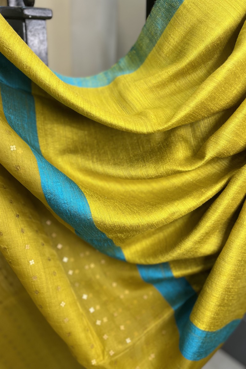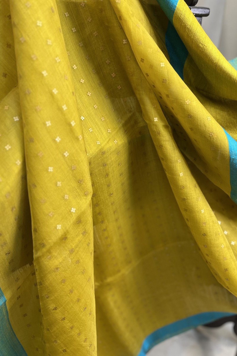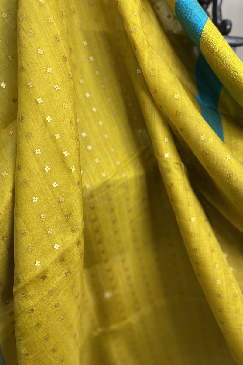 Brighten your wardrobe with this Yellow-Greenish Pure Matka Silk Saree, handwoven to perfection. The contrast Firozi border adds a refreshing pop of color, while the sequins-adorned pallu shimmers beautifully — a perfect blend of tradition and modern charm.