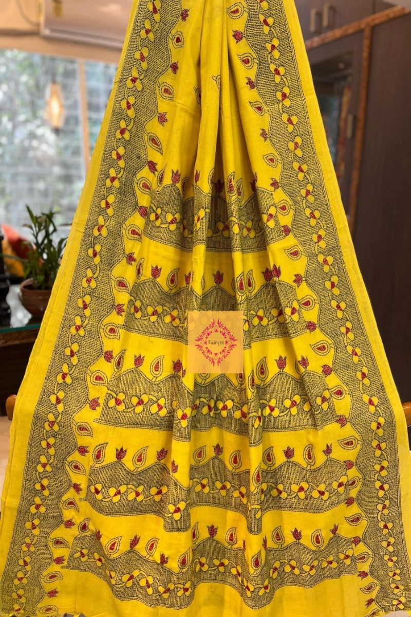Intricately done beautiful Kantha hand embroidered sarees on Pure soft Khadi cotton. Contrast Blouse Piece included with embroidery on sleeves.